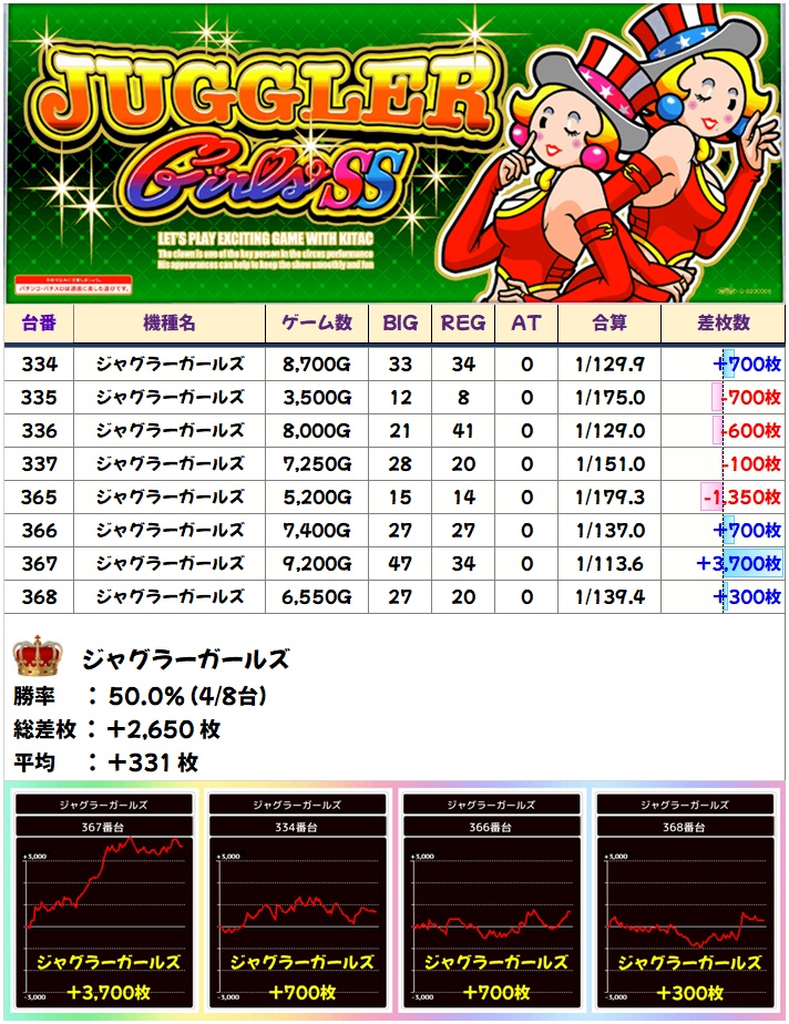 🌈ジャグラーガールズ(8台)【平均+331枚】