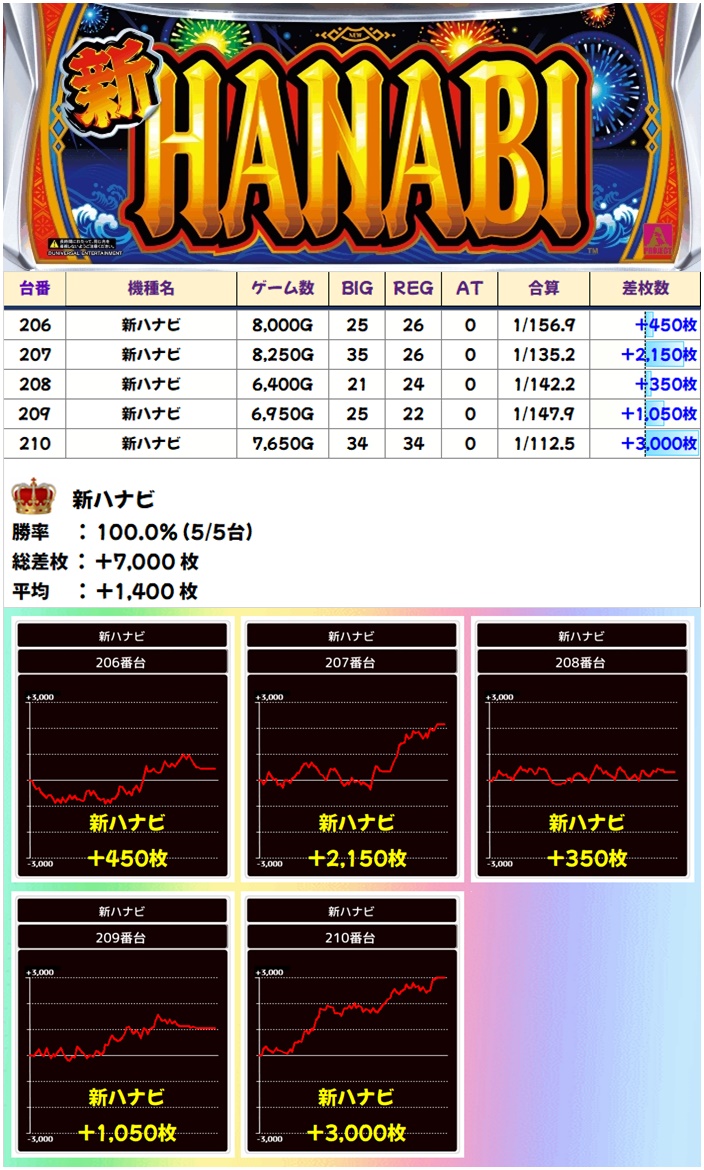 新ハナビからは全台プラス&平均+1400枚と好結果に!全台しっかりと打ち込まれていました!