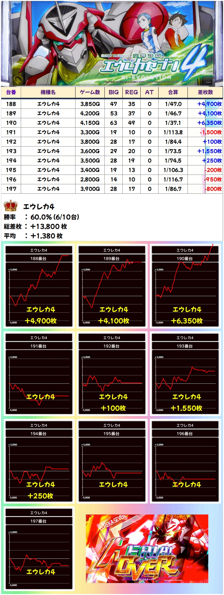 まずはエウレカ4から! 6/10でプラスとなり平均は+1380枚!こちらは並び仕掛けがあったかも!?