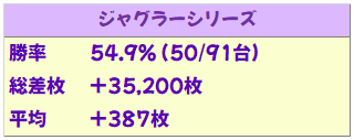 安定のジャグはいつも通りの高配分で、ジャグは勝率50/91の平均+387枚と好結果に!