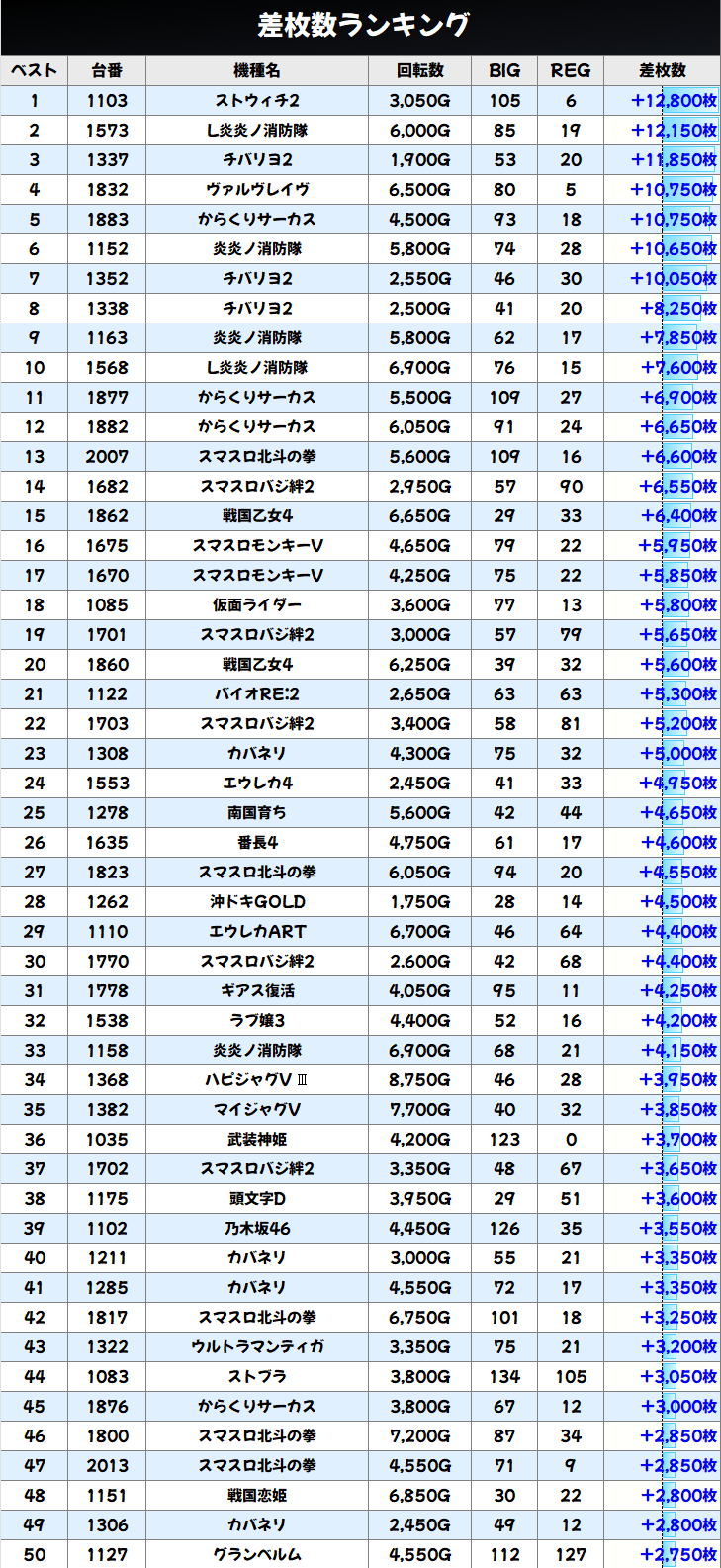 万枚が7台も出たのでかなり派手なランキング結果に。上位陣はほとんどがスマスロですが、6位に入った6.5号機の炎炎がスゴい。その次の6.5号機は21位のバイオRE:2までないぐらいですから…。