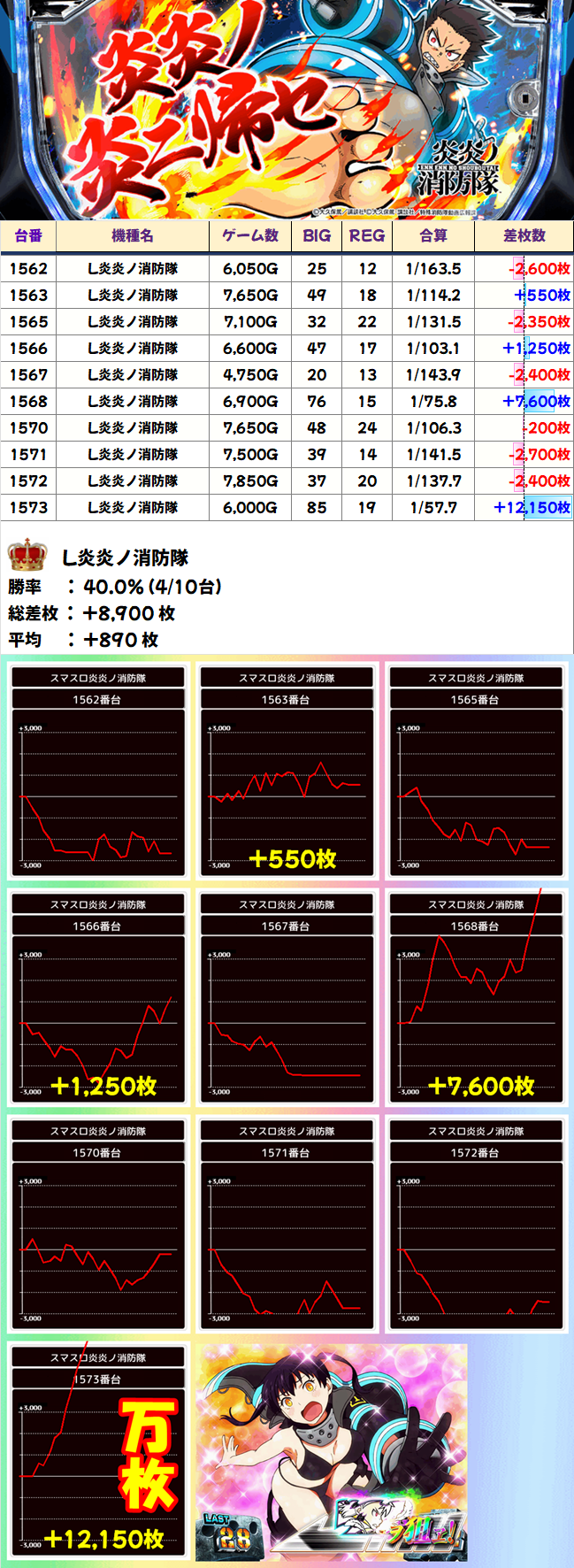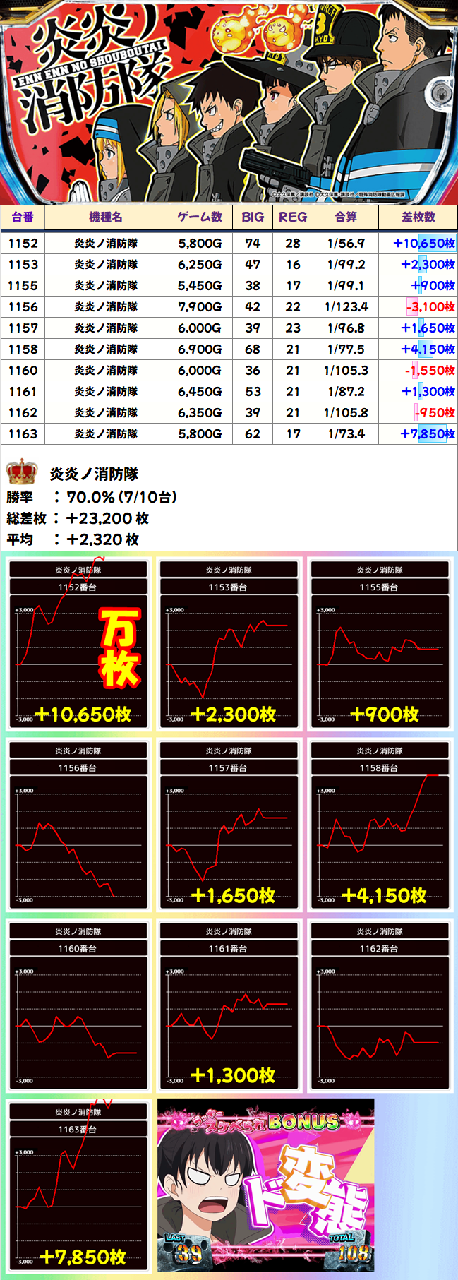 1152番台、6.5号機の炎炎で万枚を達成しました。炎炎激闘の展開次第とはいえ、ここまで伸ばしたのは紛れもなく豪腕!