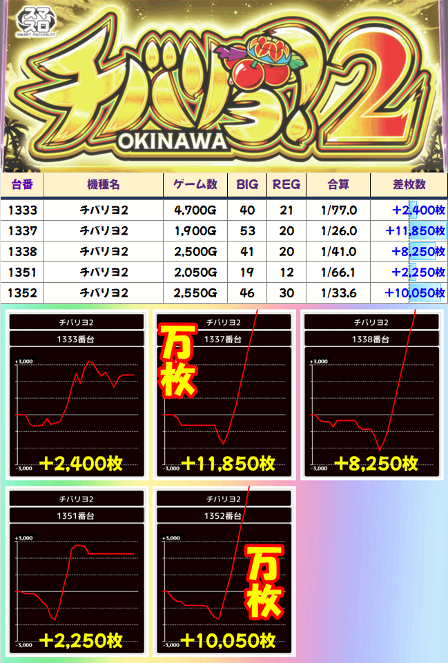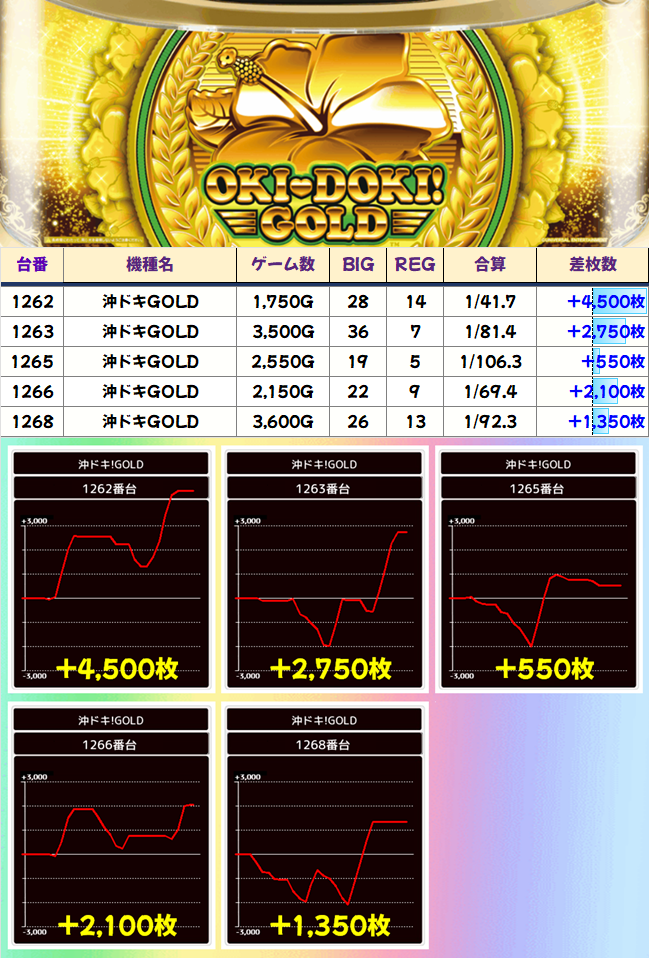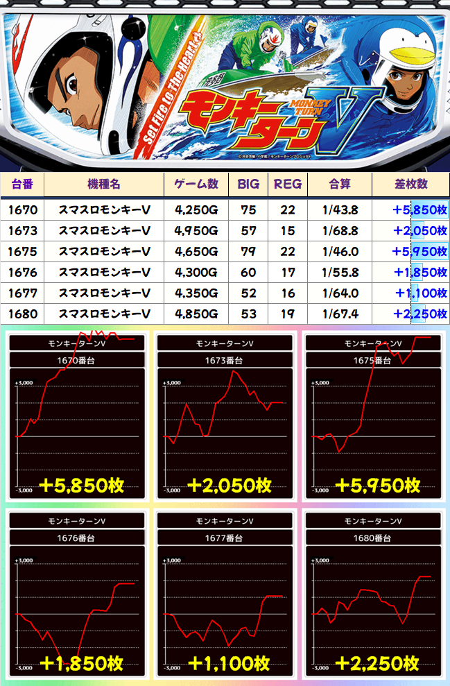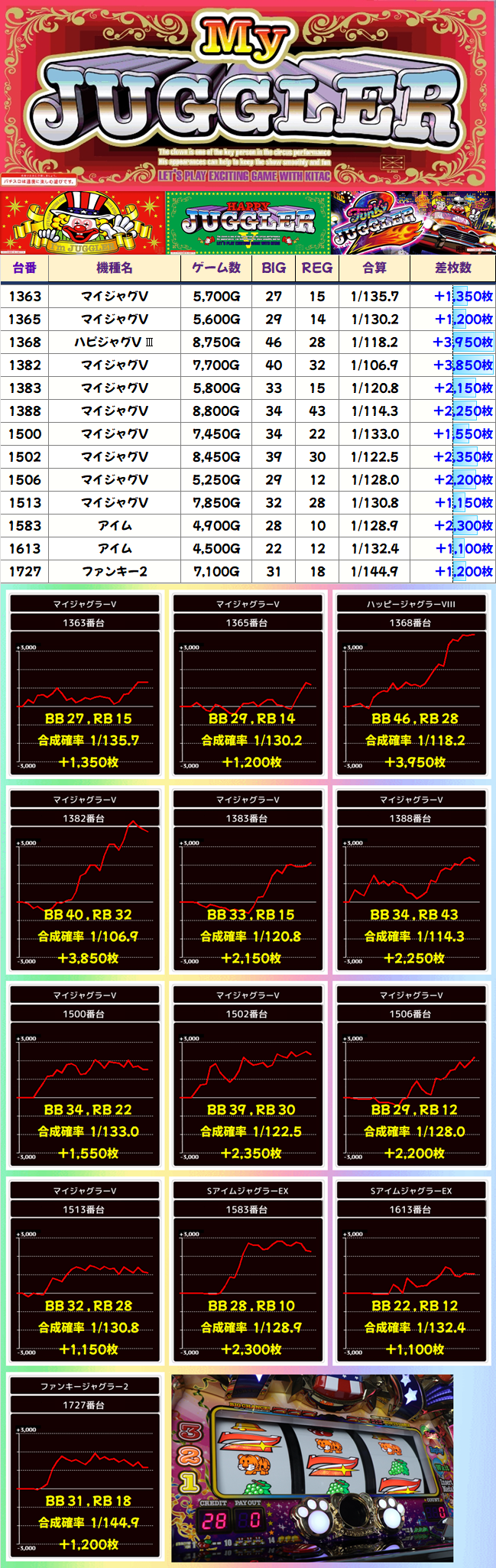 超強カワループで伸ばしまくったのが5000枚over×2台。1868番台はAT直撃も絡めて安定挙動。