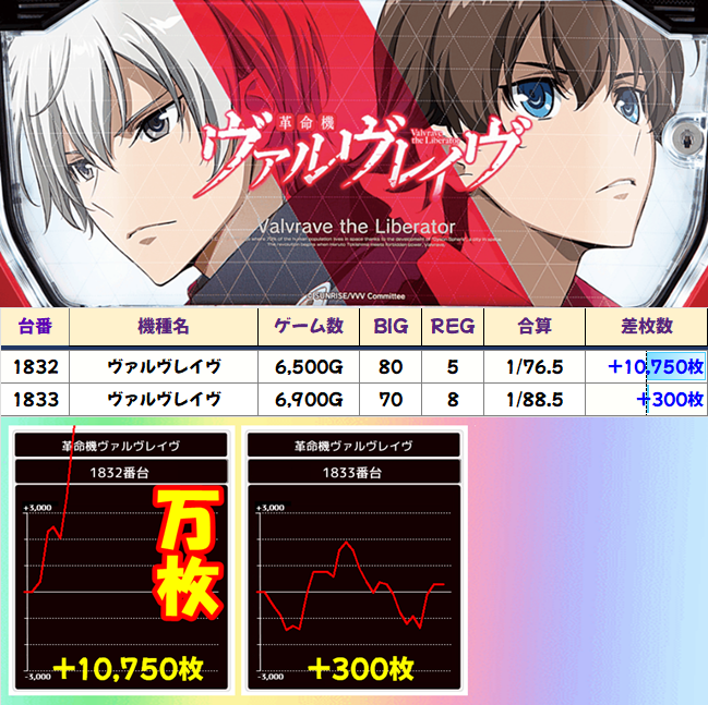 スマスロ=万枚の代名詞ともいえるヴヴヴ。1832番台は早々に決めたものの、6500G回して万枚キープはなかなかです。