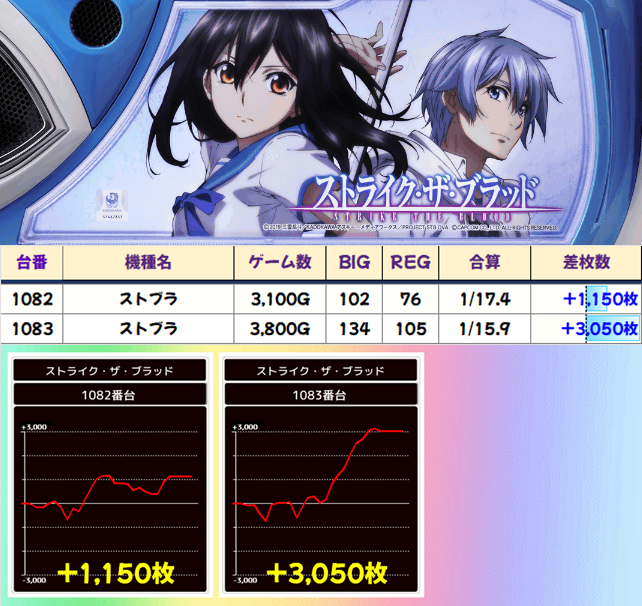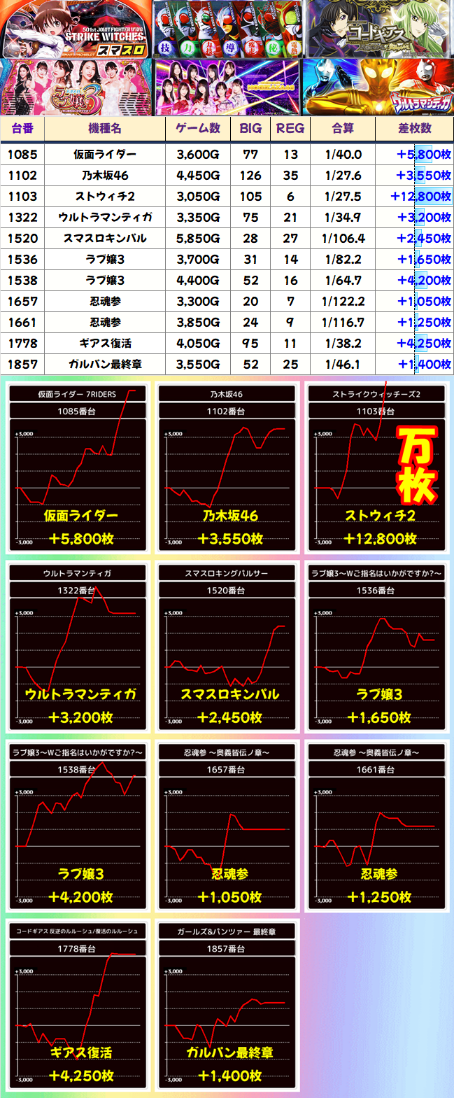 ガルパンとラブ嬢以外は軒並みエグいグラフ。万枚達成のストライクウィッチーズ2は上位ATの破壊力がすさまじいですが、通常時に大きなハマリがないのは高設定挙動では!?