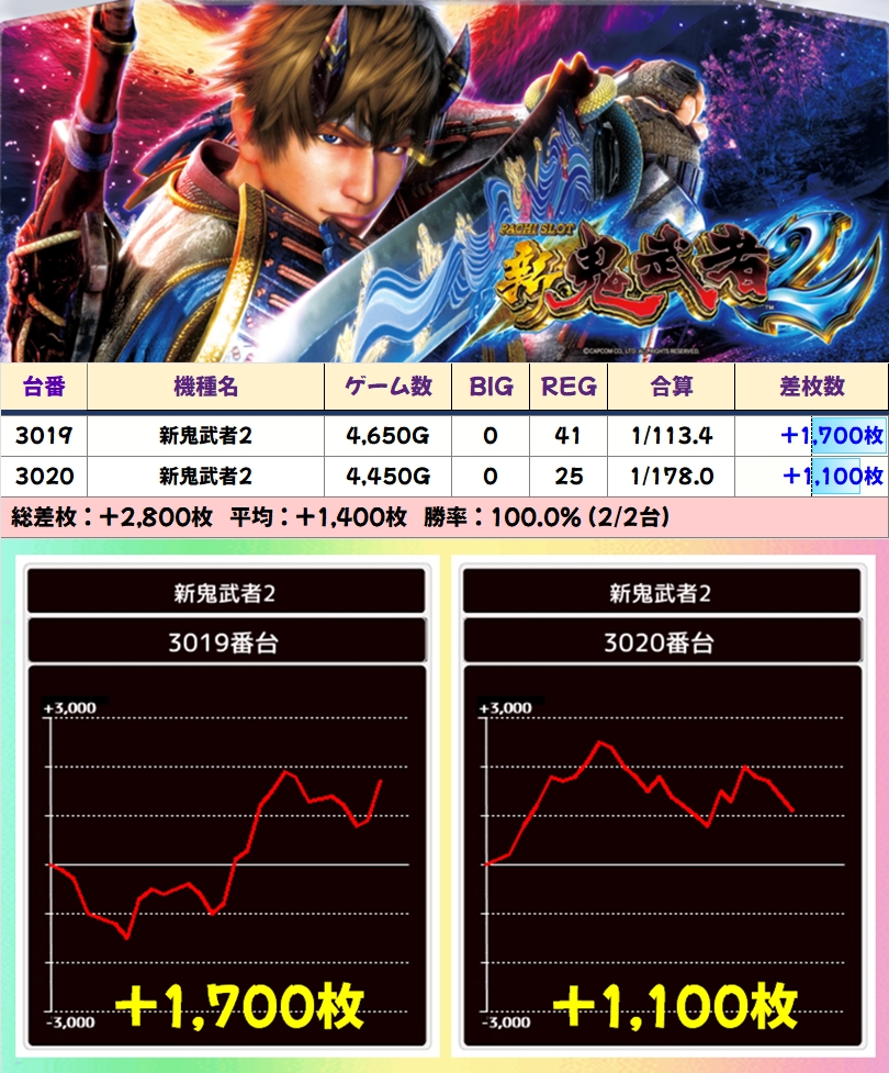 新鬼武者2は大爆発とはなりませんでしたが、2台ともプラス差枚と安定した結果になりました!