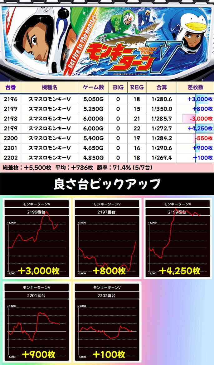 モンキーVは勝率71%、+4250枚が飛び出す優秀な結果に!