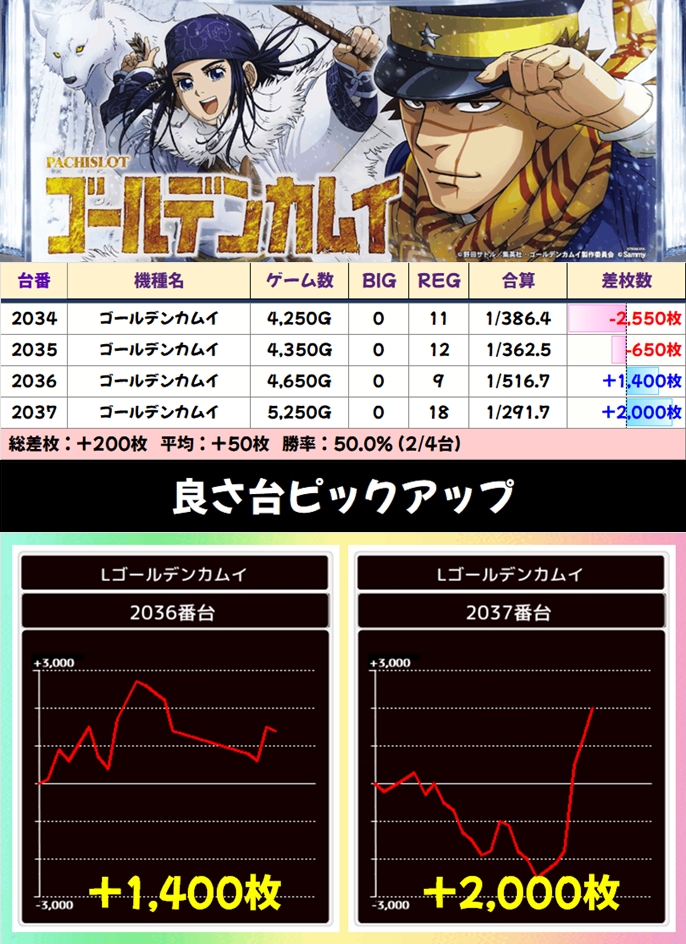 ゴールデンカムイは大爆発とはいきませんでしたが、勝率50%の安定した結果に。