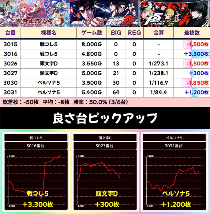 【1/2系濃厚】戦コレ5・頭文字D・ペルソナ5(計6台)|勝率:50.0%