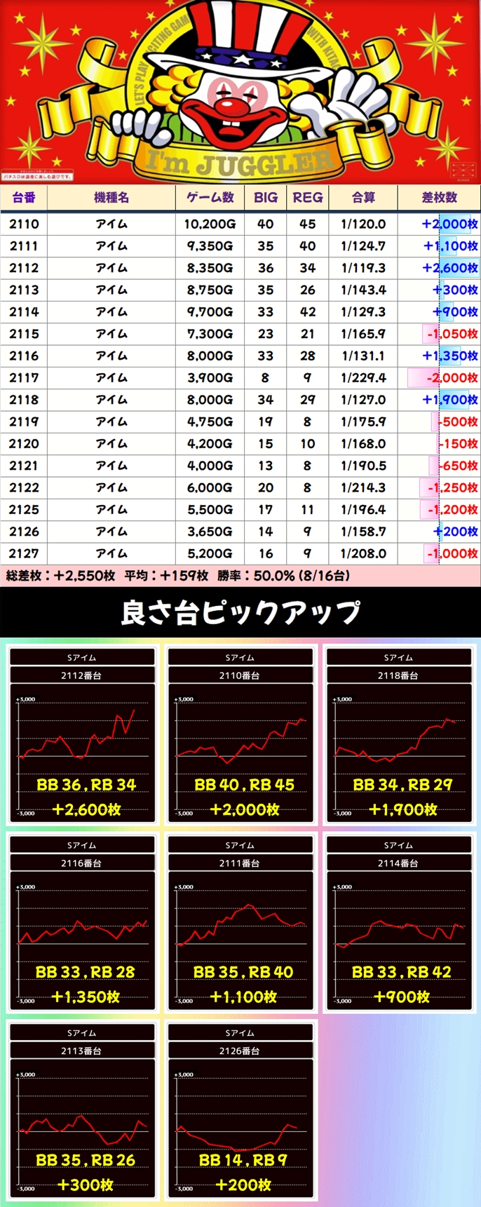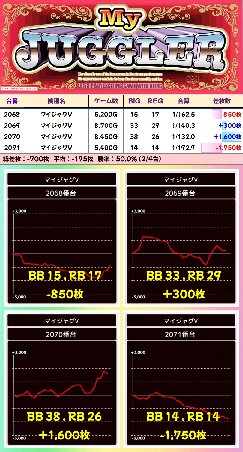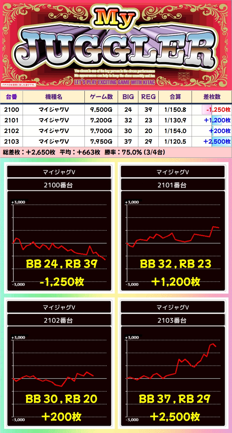 マイジャグVは8台中5台がプラス差枚、+2500枚が飛び出す安定した結果となりました!
