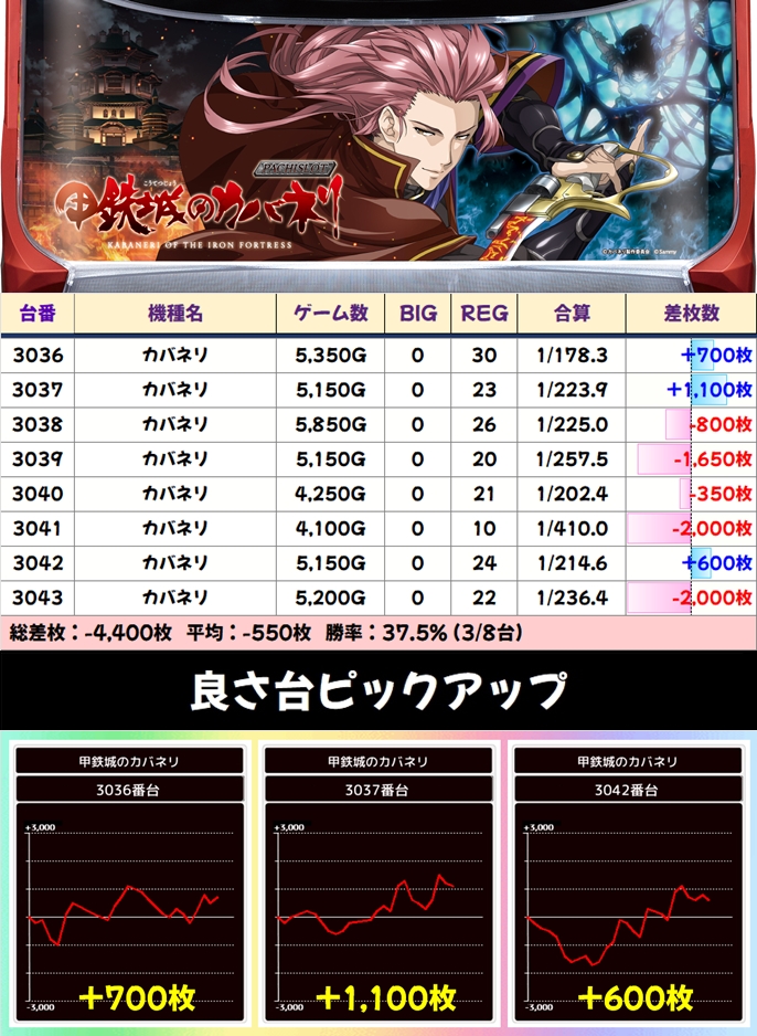 番長ZEROから+5250枚、ギアス3CCから+3000枚、このすばから+5500枚と、こちらも爆発台が大量!