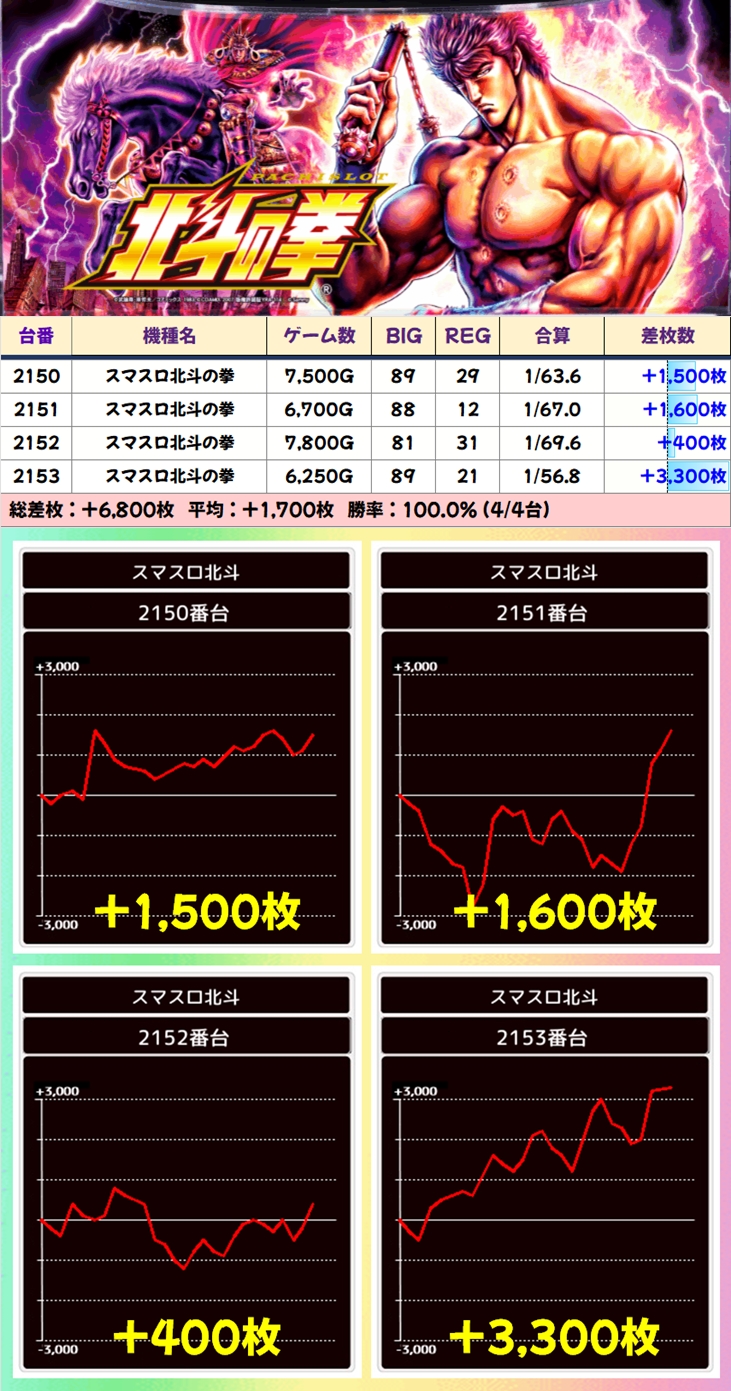 スマスロ北斗は全台がプラス差枚、+3300枚が飛び出す優秀な結果に!