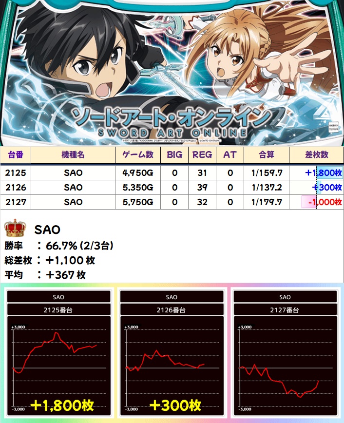 おそらくSAOはキャラ誕(ユウキ)仕掛けになっていた可能性が高いので、キャラ誕機種を把握しておくと立ち回りが有利になるかもしれませんよ。
