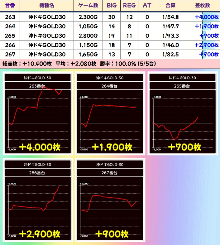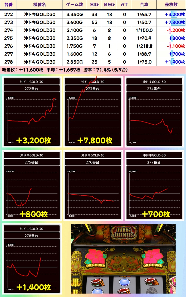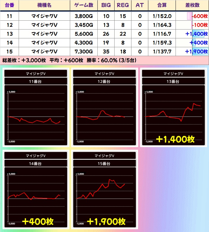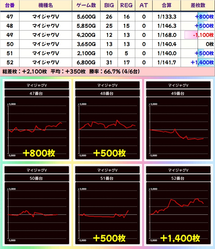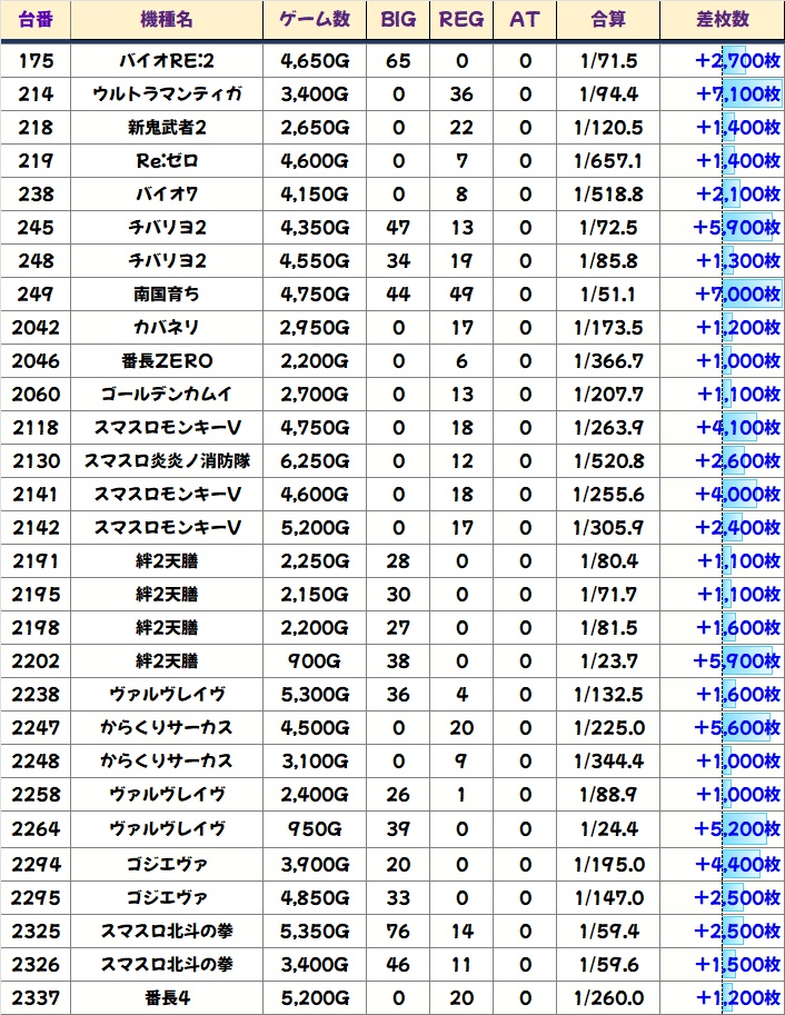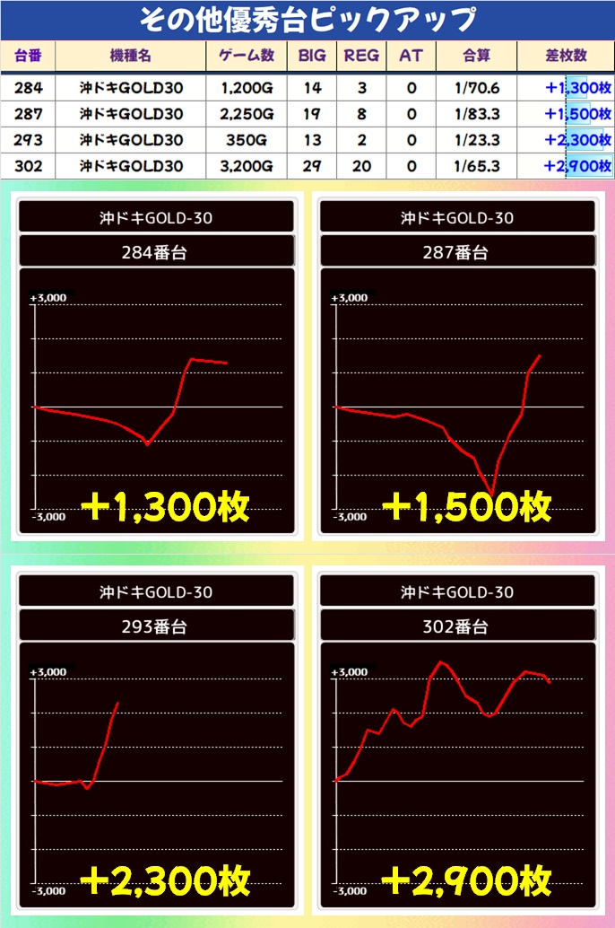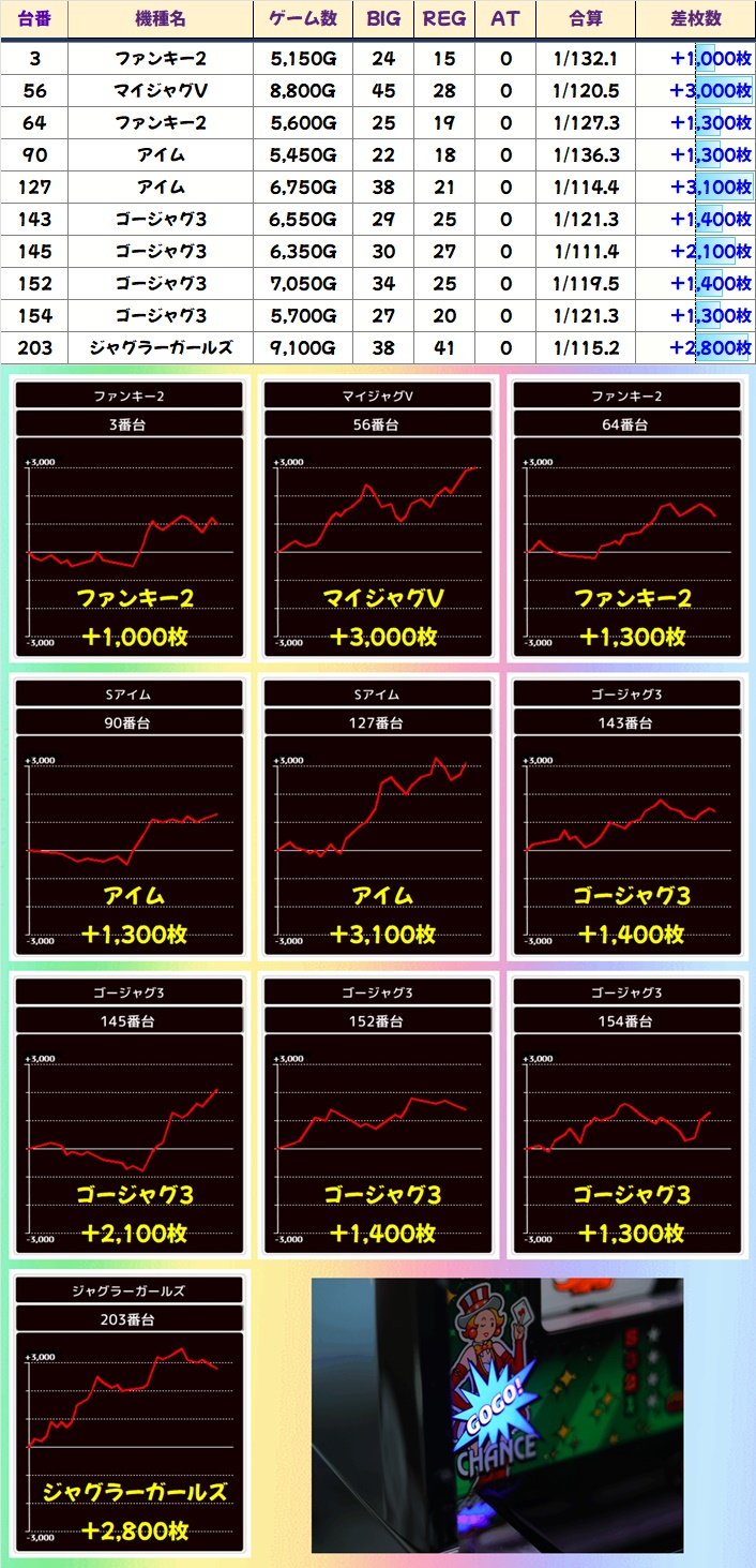 30パイはもちろん、ジャグ・ノーマル・少台数機種には優秀機種や塊が随所に見られました。それ以外にも好調機種があり、幅広くチャンスが用意されていたようです。