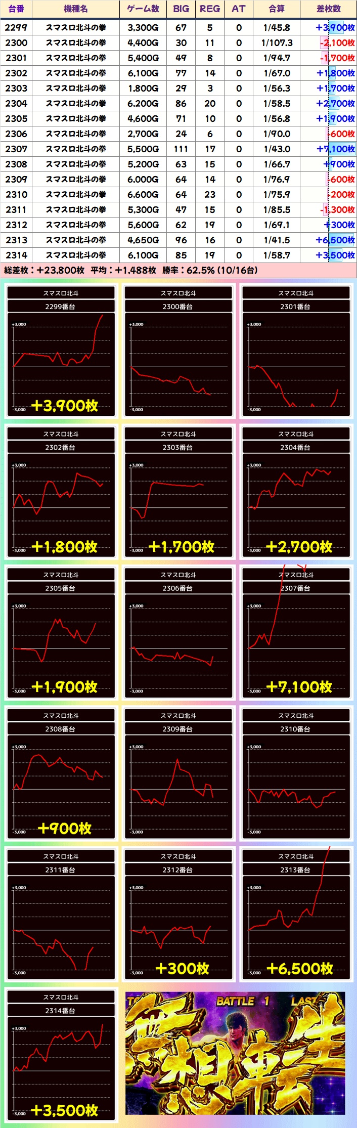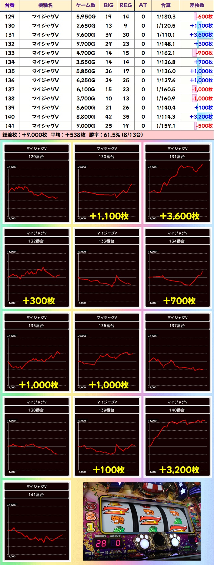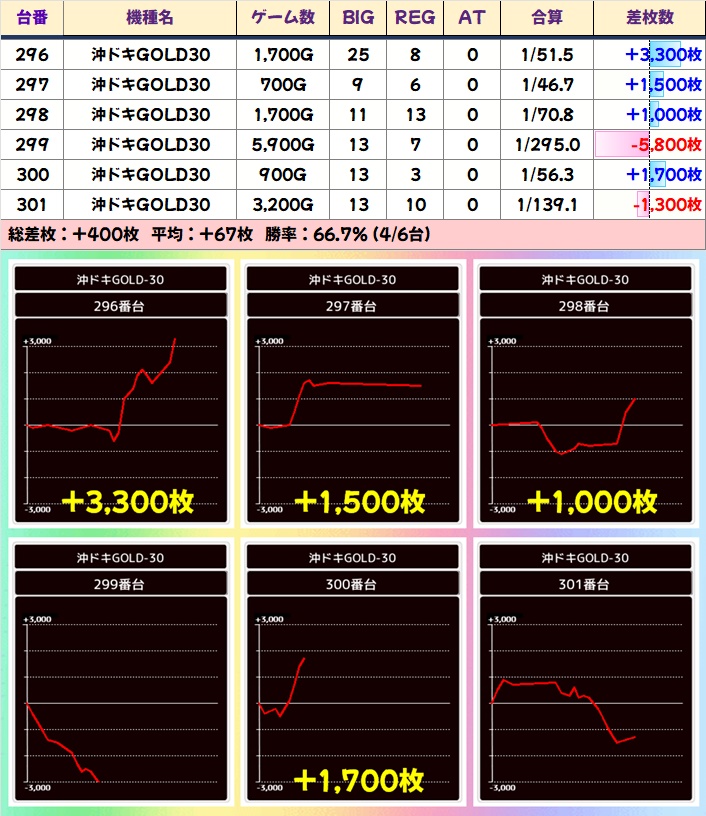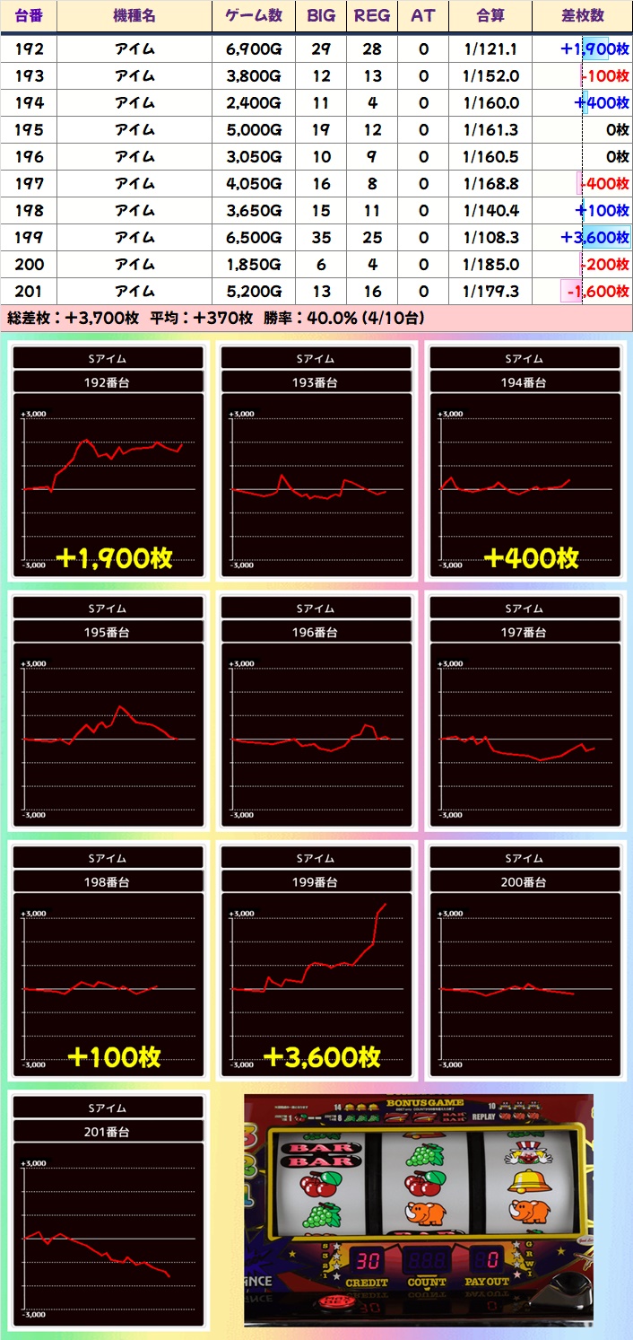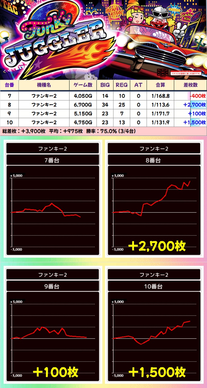 30パイはもちろん、ジャグ・ノーマル・少台数機種には優秀機種や塊が随所に見られました。それ以外にも好調機種があり、幅広くチャンスが用意されていたようです。