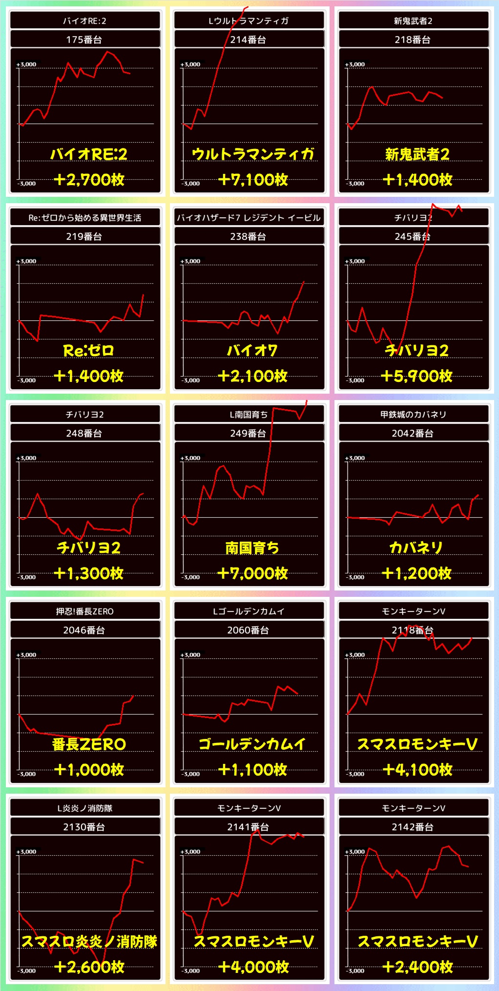 上記でまとめた仕掛け箇所以外にも+1000枚以上の優秀台が至るところから散見されました。なかには高配分になっていた機種もあったのかもしれません。単品も幅広く散りばめられているので、どこにでもチャンスがありますよ。