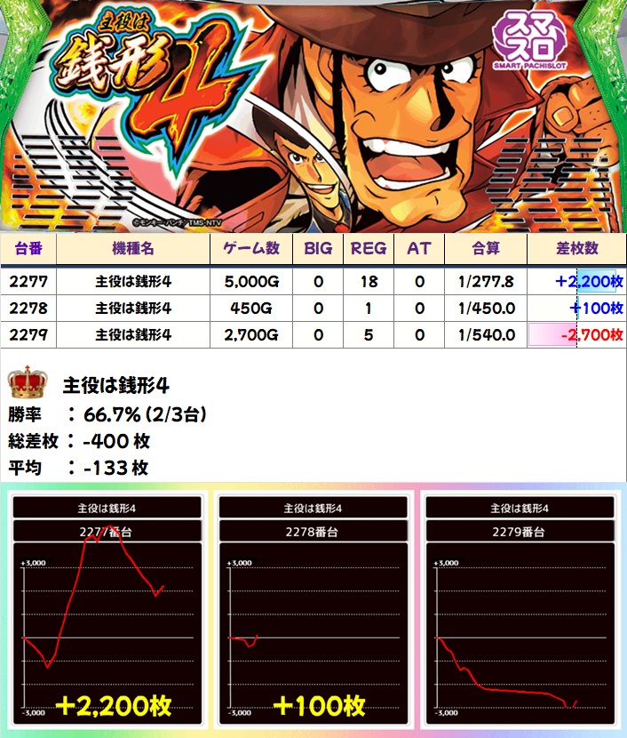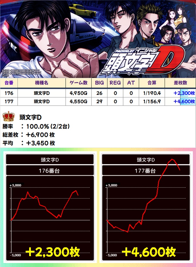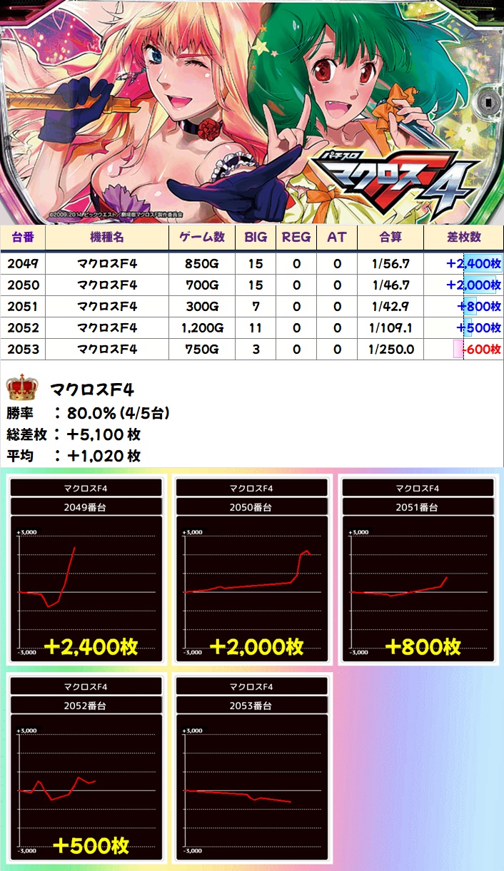 マクロスは5台中4台がプラスで、平均+1000枚オーバーという好結果。稼働は若干もの足りない印象ですが、これだけ安定して出ていれば全台系だった可能性が高そうです。
