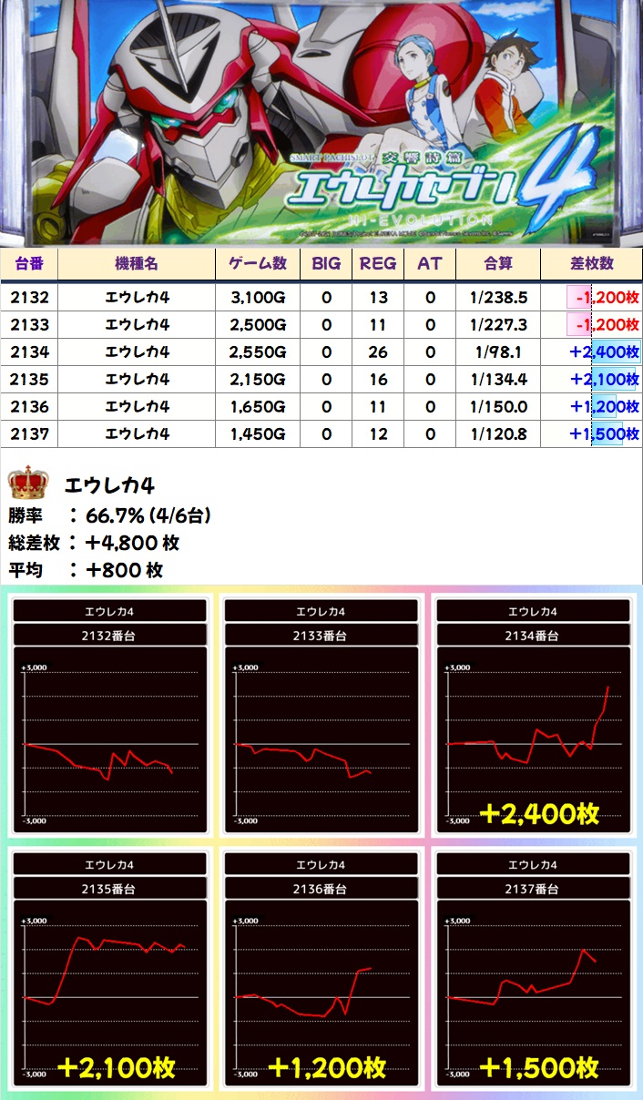 エウレカ4は6台中4台がプラス。マイナスに終わった台もありますが、大きな凹みもなくコンスタントに当たりが引けている様子から高設定らしさが窺えます。
