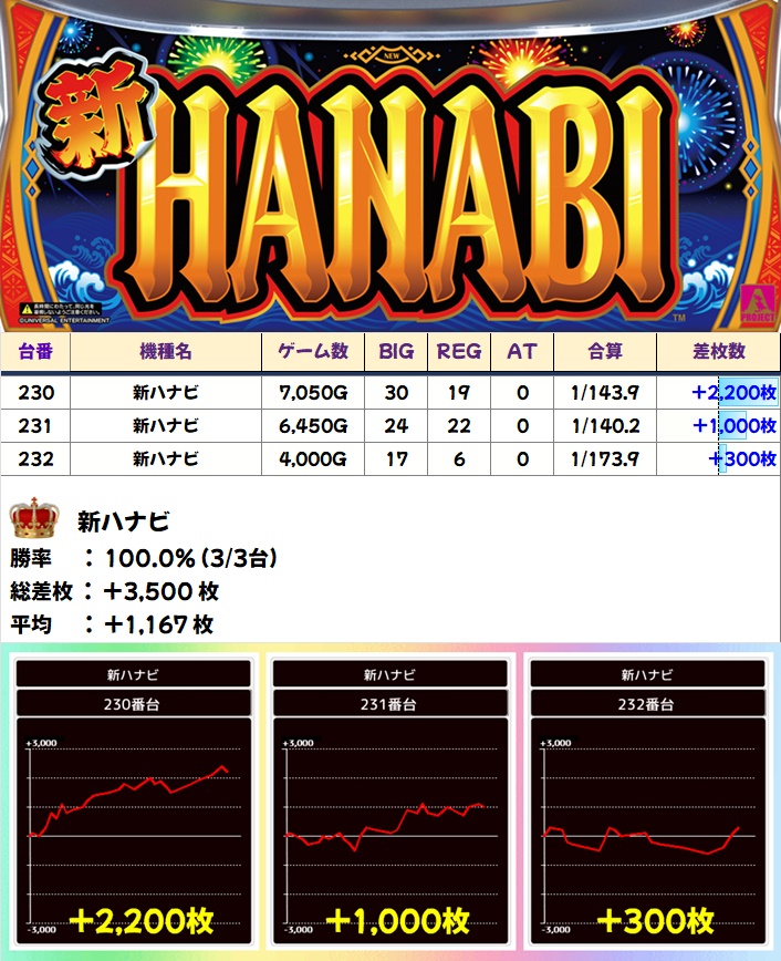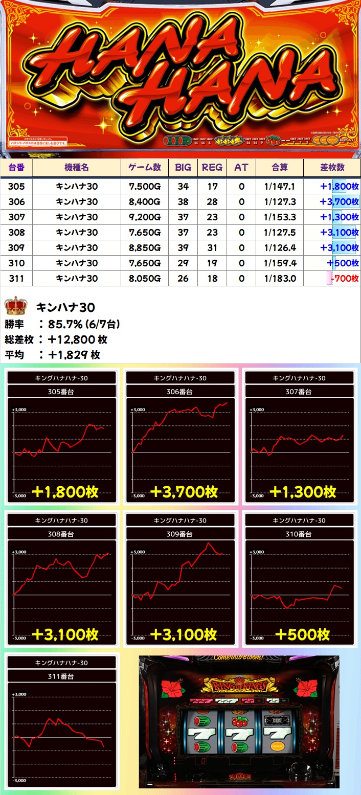 3のつく日は定番で30パイに強めの仕掛けがあります。今回はキンハナが全台系濃厚になっており、7台中6台がプラスで平均+1,800枚超という好成績をマーク。キンハナは全台系濃厚になることが多いので今後も要注目です。