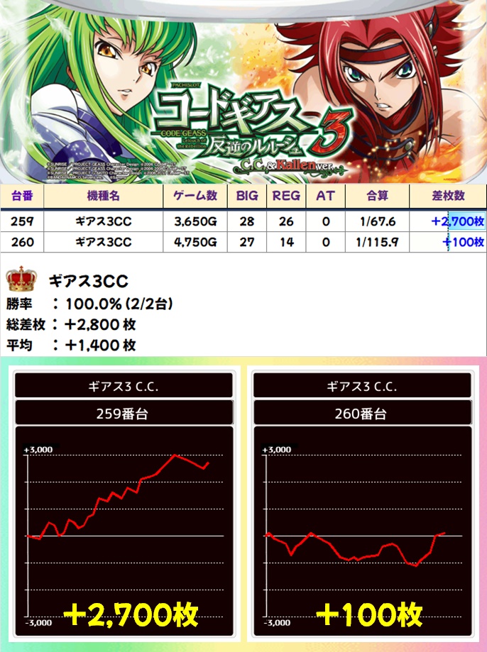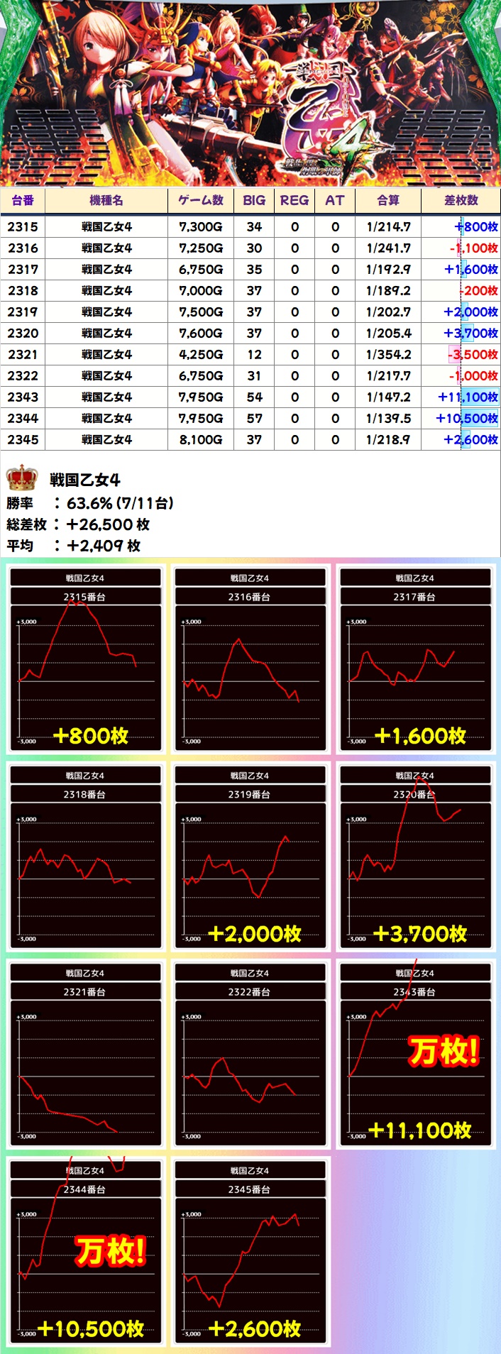 戦国乙女は11台中7台がプラスで、そのうち2台が万枚突破。勝率の高さに加え平均+2,400枚という好成績を見るに、全台系と見てよさそうです。