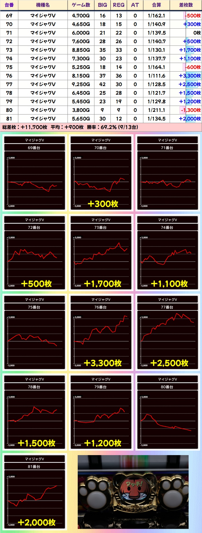 今回も30パイの仕掛けが強力でしたが、ジャグ・ノーマル・少台数機種にも充実した仕掛けがあり、台数が多めの主要機種にも抜かりない仕掛けが用意されていました。これだけの仕掛け量であれば総差枚+8万枚超というのも納得です。
