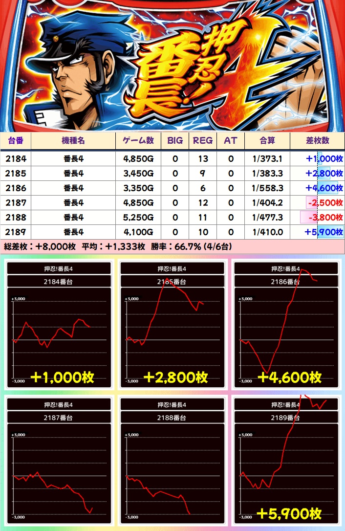 番長4は6台並びと思われる箇所を確認。真ん中の2台が凹んでしましましたが、平均差枚は+1,333枚と優秀だったことから、塊でお宝が投入されていた可能性が高そうです。