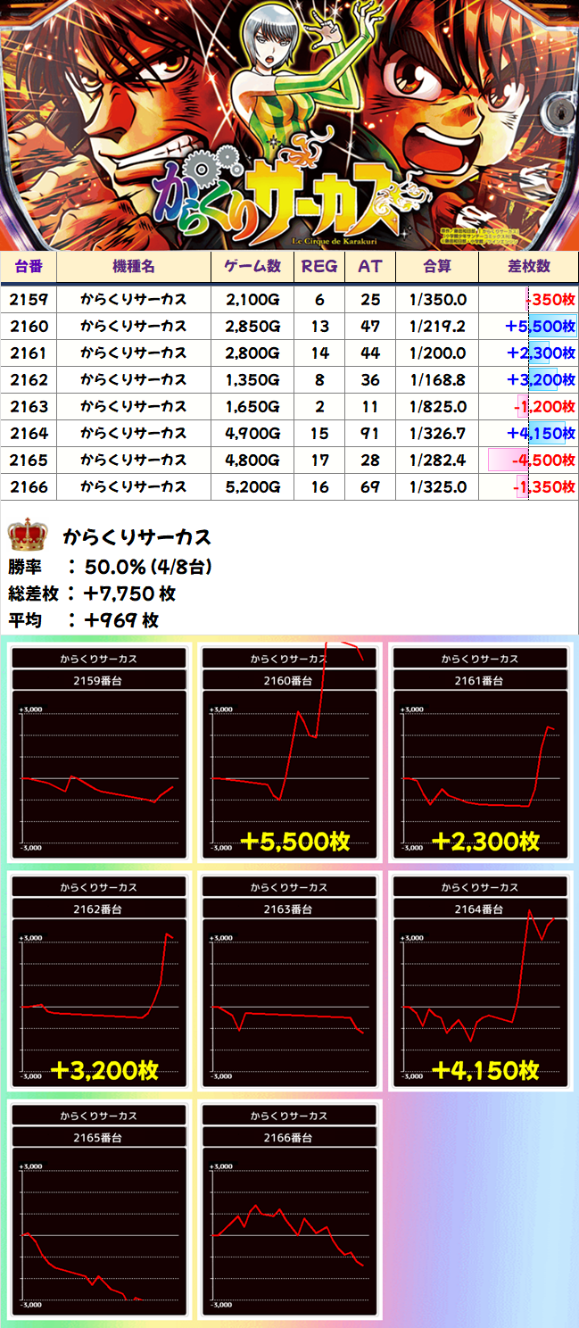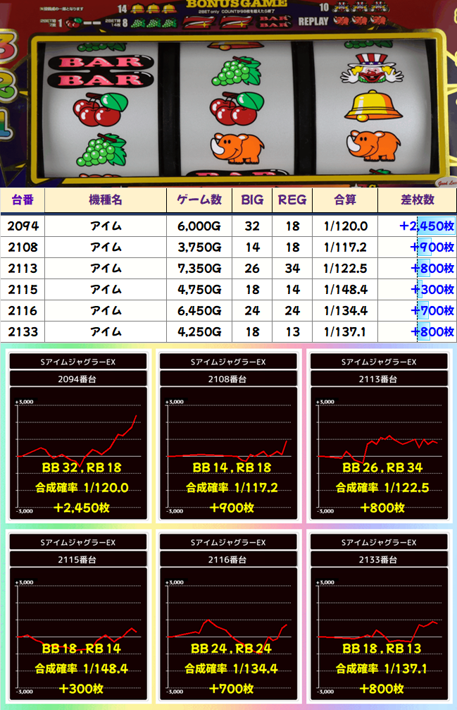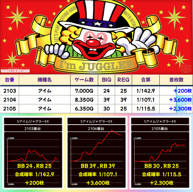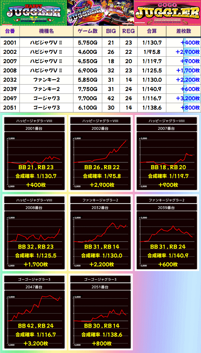 アイムとマイジャグ以外では、66回のペカリを達成したゴージャグが優秀。ハピジャグの2002番台は終盤で一気に伸ばしてきました。粘りの勝利です。