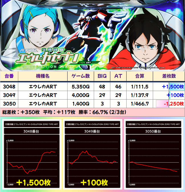 全台7000G超の稼働。BIG回数もAT回数も、この3台だけシマの中で頭一つ抜けてました。