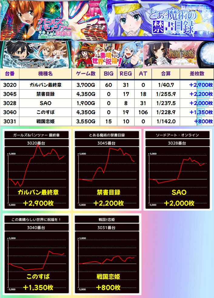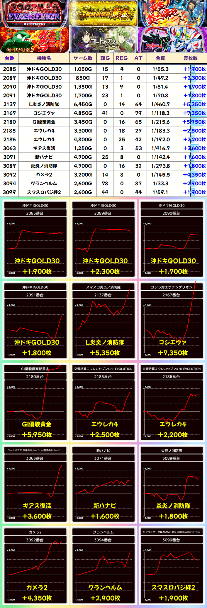 2台設置ながら出玉力の高さがあるGI黄金は要注目か。あとはゴジエヴァの一撃までの粘りや、炎炎の挙動をチェックしておきたいところ。
