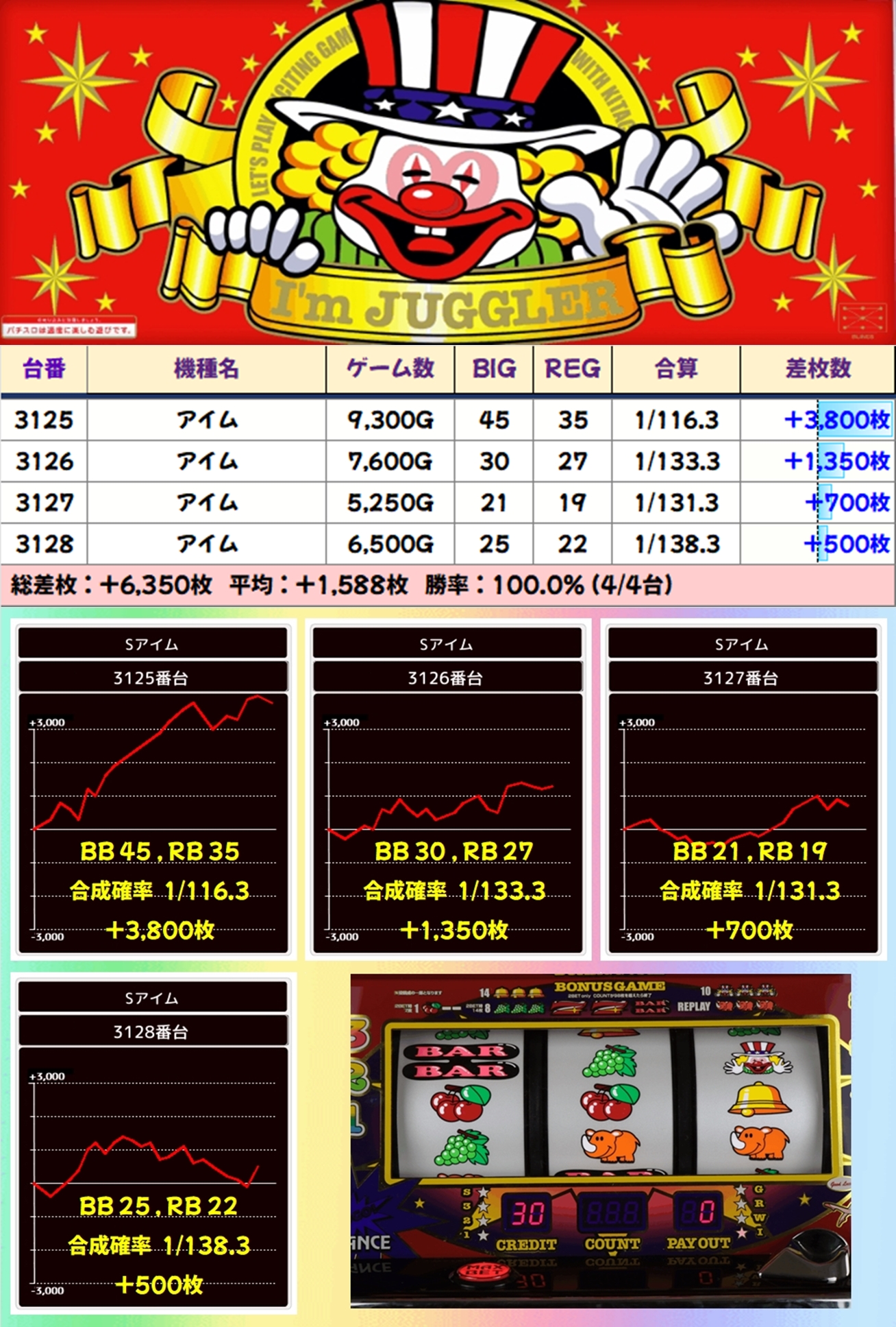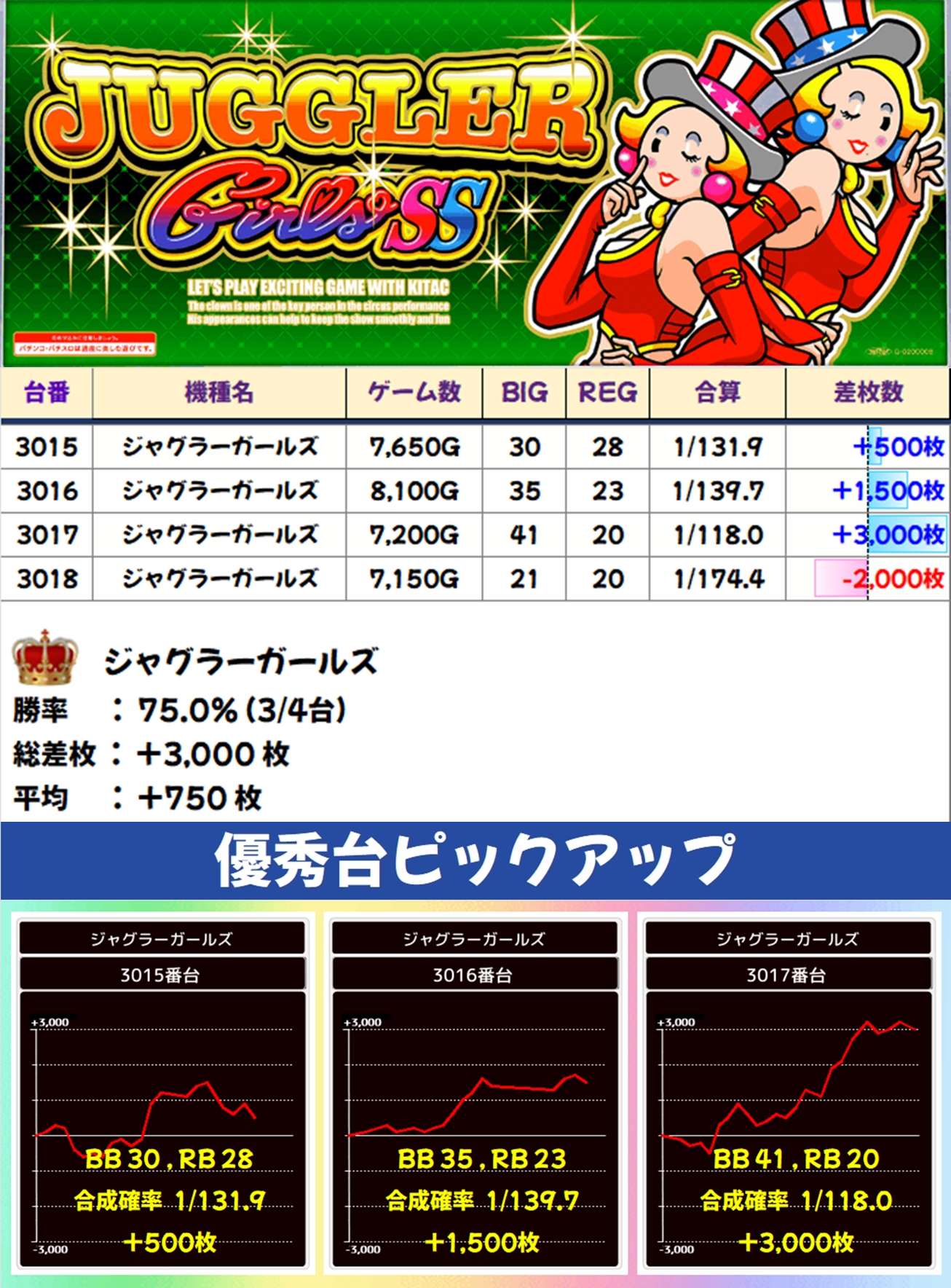 ジャグラーガールズも1/2系濃厚で、4台中3台がプラスとなりました。また、ジャグラーガールズもファンキー2やゴージャグ3と同様に稼働がバッチリでした。