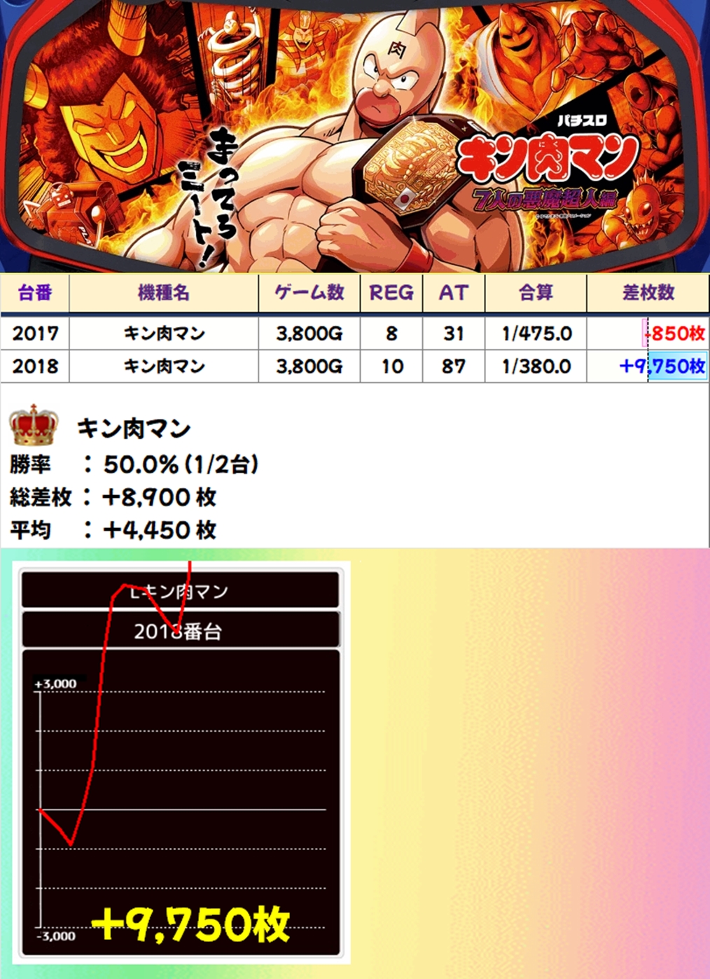 キン肉マンは2台の設置でしたが、1台が万枚に迫る出玉を獲得。ツボにハマって一気に出玉を獲得した模様ですね。