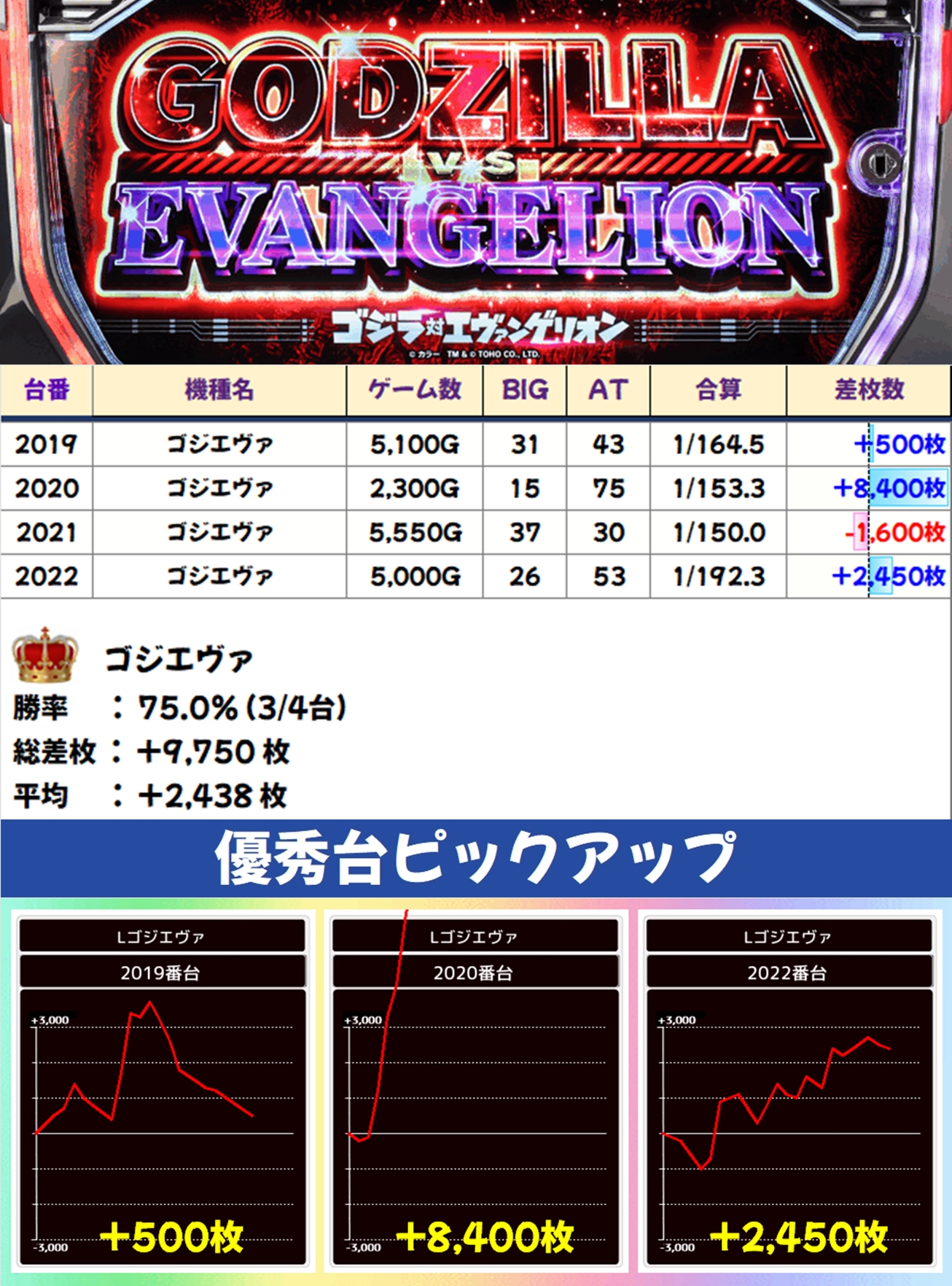 ゴジエヴァは4台中3台がプラスとなり、+8,400枚の大量出玉も確認。平均で+2,438枚の好結果となりました。マイナスとなってしまった台もしっかり打ち込まれていたので、何かしらの示唆などが出現していたか⁉