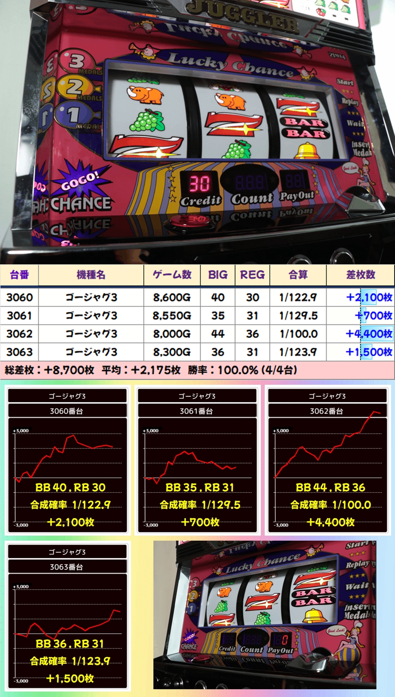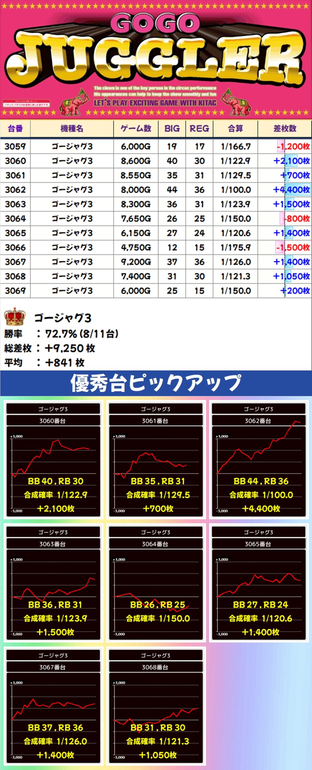 ゴージャグ3も全台がしっかり打ち込まれ、11台中8台がプラスに。なかにはボーナス合算が1/100で+4,400枚という見事な出玉も確認できました。