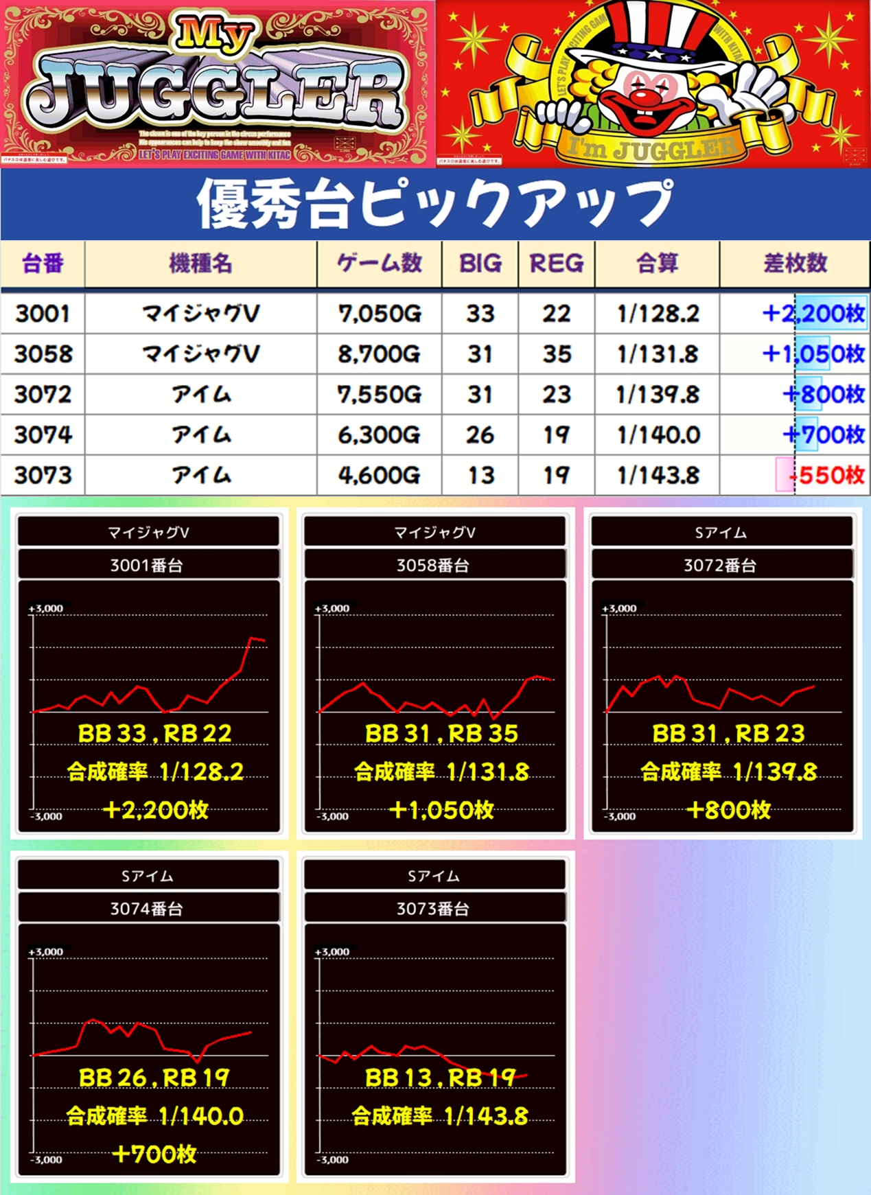 1/2系濃厚や並びの仕掛け以外でも、⑤のつく日のジャグは優秀台が多数アリ! マイジャグVとアイムから優秀台を確認でき、アイムの3073番台は出玉がマイナスとなりましたが、REG出現率は優秀な数値になっていました。