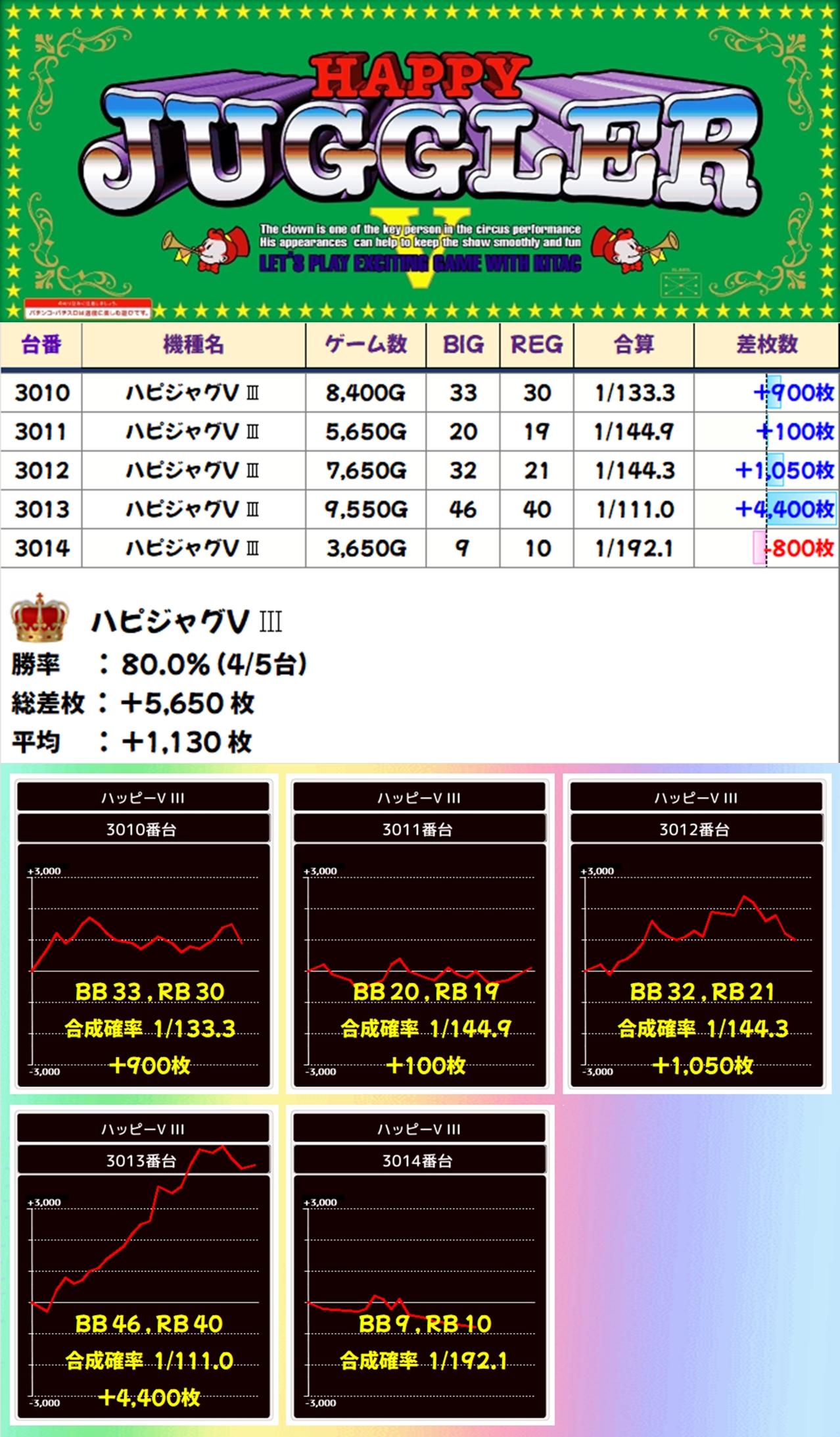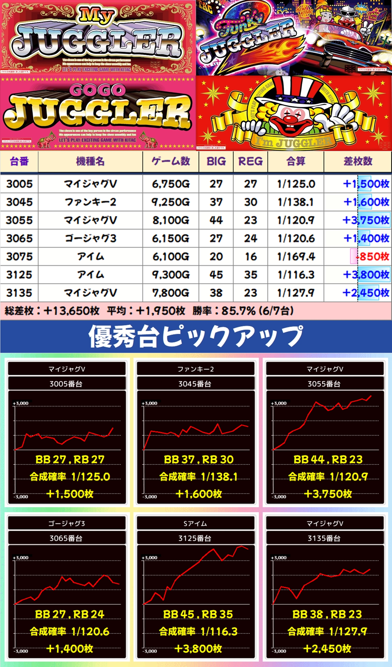 末尾⑤のジャグラーシリーズで不発となったのは1台のみ。それ以外の末尾⑤はいずれのジャグもボーナス回数・差枚ともに優秀な結果となりました。