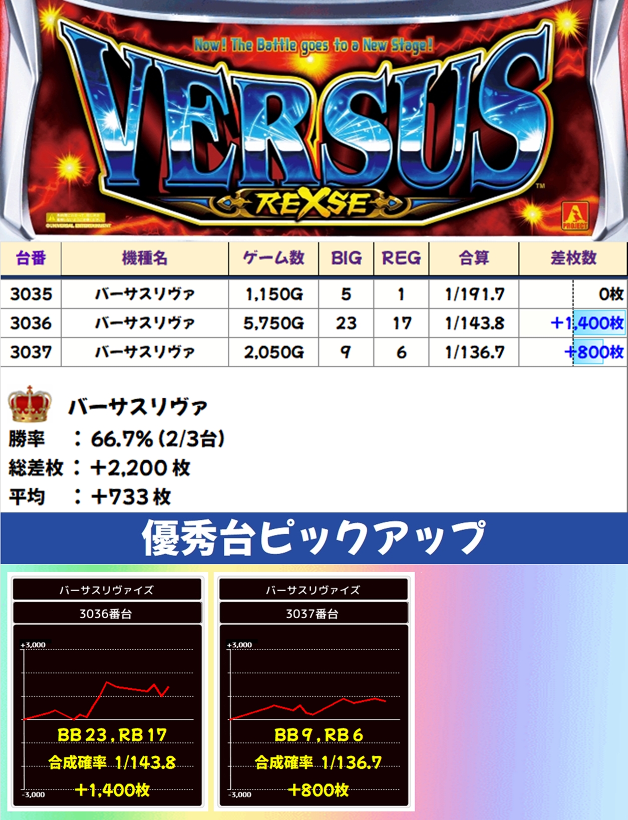 バーサスリヴァイズは3台中2台がプラスに。総差枚は+2,200枚で平均+733枚となりました。