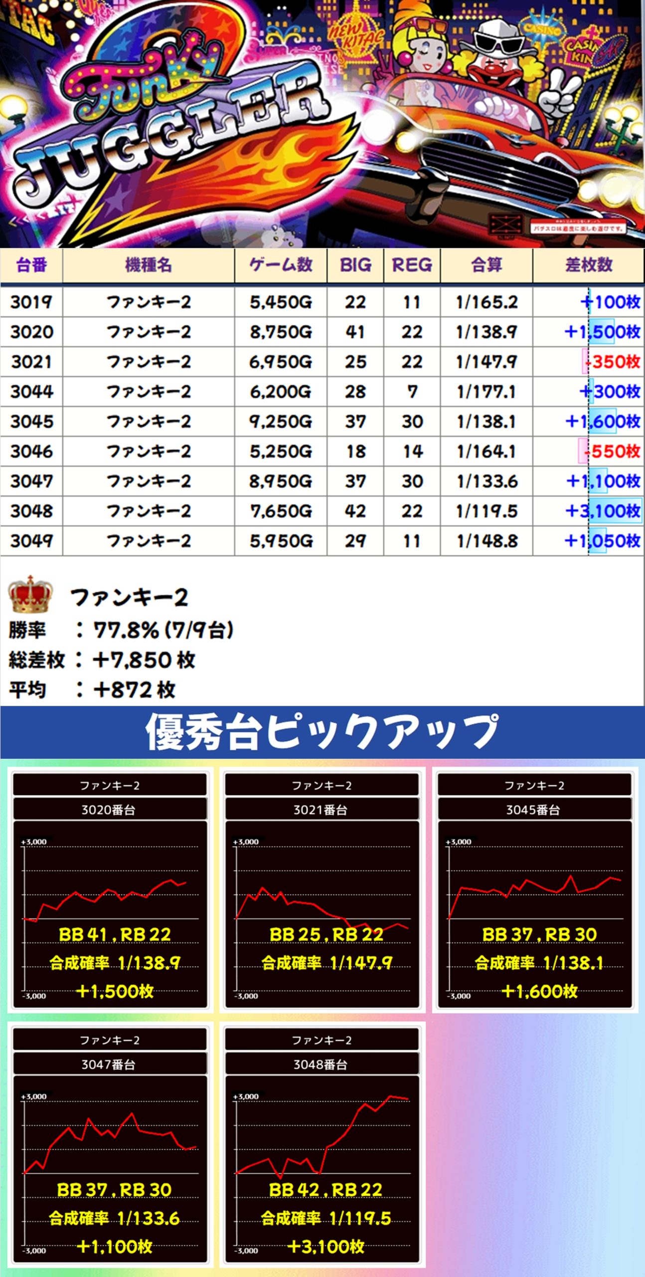 ファンキー2は+3,100枚などの出玉を確認でき、9台中7台がプラスに。2台がマイナスとなってしまいましたが、全台がしっかり稼働して盛り上がっておりました