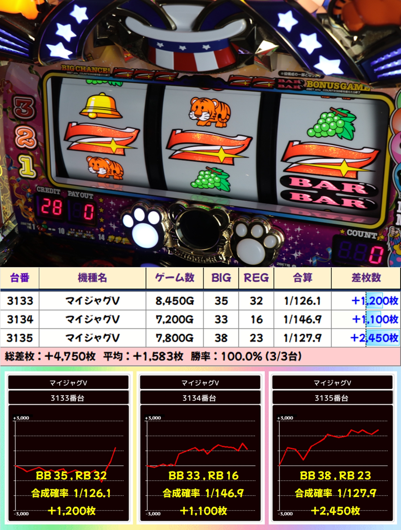 マイジャグVから③台並びが3か所、ゴージャグ3とアイムからは④台並びの優秀な出玉が見受けられました。今回の並びの仕掛けでは、全台がプラス差枚となり、ボーナス出現率もバッチリでしたね。