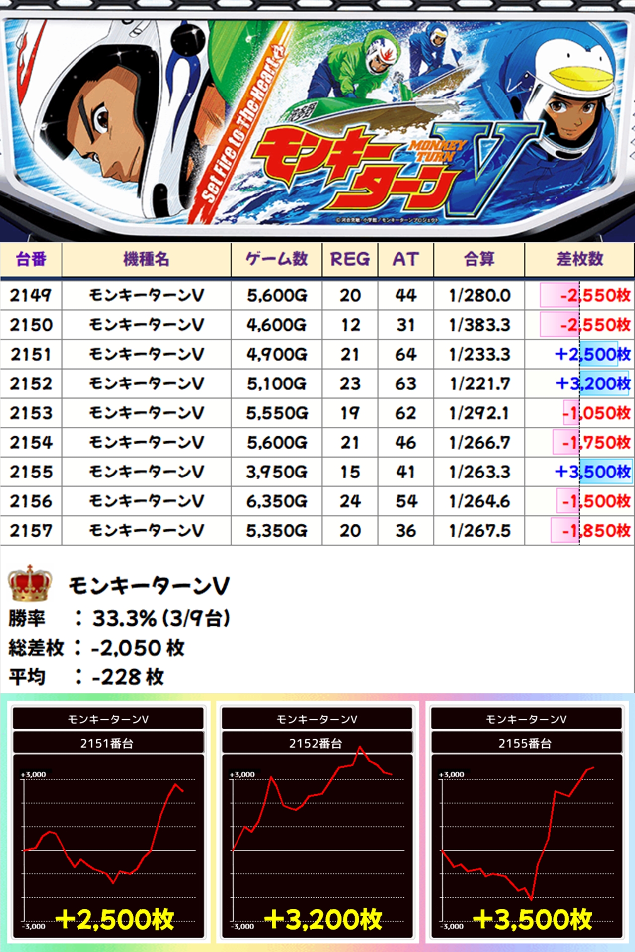 モンキーターンVでプラスとなったのは9台中3台でしたが、プラスとなった台はいずれも優秀な出玉を獲得。マイナスとなってしまった台も稼働はバッチリだったので、示唆などが出現していたのかもしれませんね。