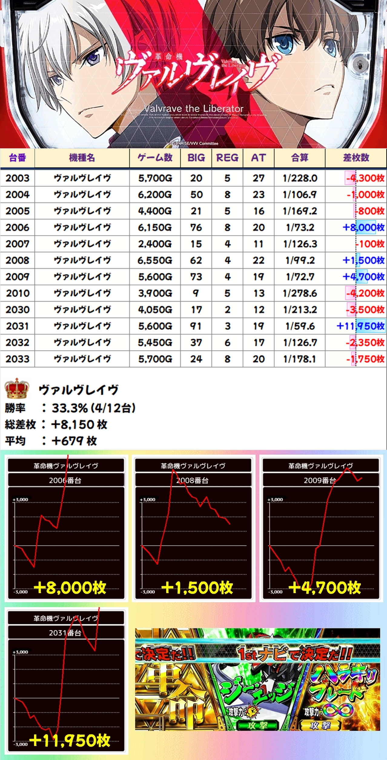 ヴァルヴレイヴは+11,950枚や+8,000枚といった素晴らしい出玉を確認。プラスの台よりもマイナスの台が多くなりましたが、合計ではしっかりプラスとなりました。こちらもモンキーターンVと同じく、しっかり稼働していたので高設定が不発で終了してしまった可能性も十分考えられるでしょう。