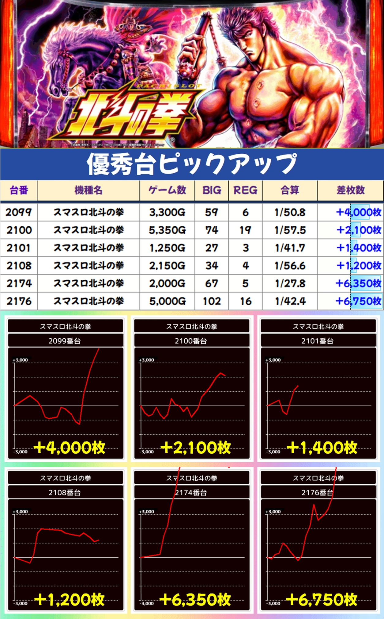 挑戦ポスター出現6日目の北斗の拳からは複数の優秀な出玉を確認。+6,350枚や+6,750枚の大量出玉も確認することができました。