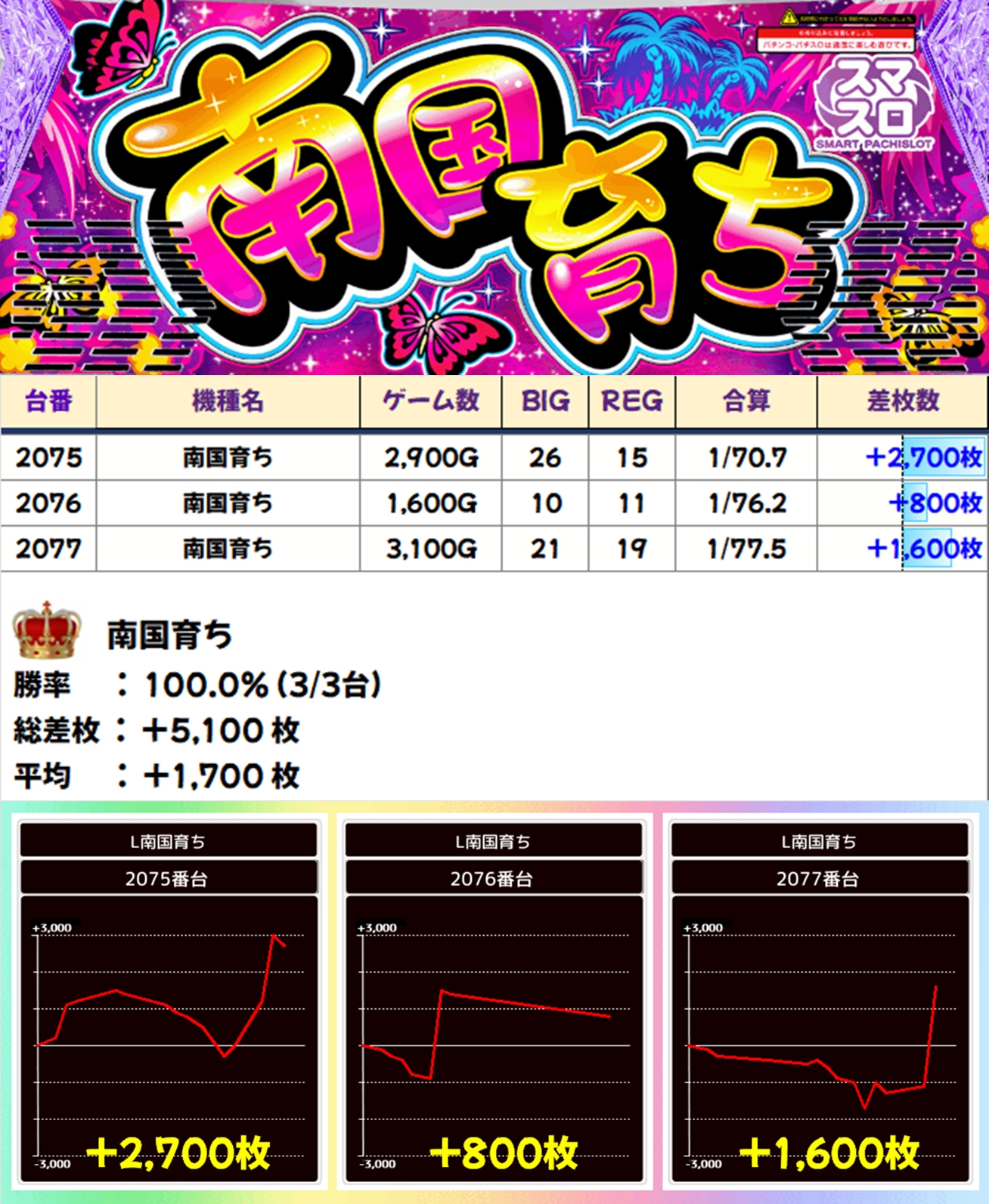 南国育ちは3台全てがプラス差枚に。打ち込みが少々少なかったことが気になりますが、好結果と言って良いでしょう。