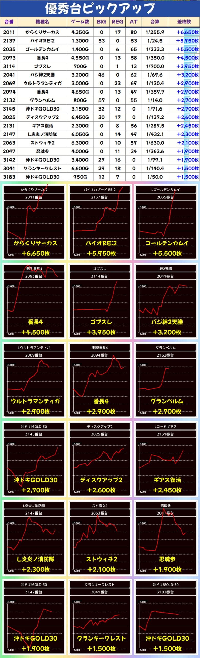 からくりサーカスで+6,650枚やバイオRE:2で+5,950枚など、ここまでピックアップした仕掛け以外にも大量出玉が多数出現。スマスロだけでなく、ノーマルタイプなどにも優秀台があるのはチャンスが多くてプレイヤーとしては嬉しい限りですね!