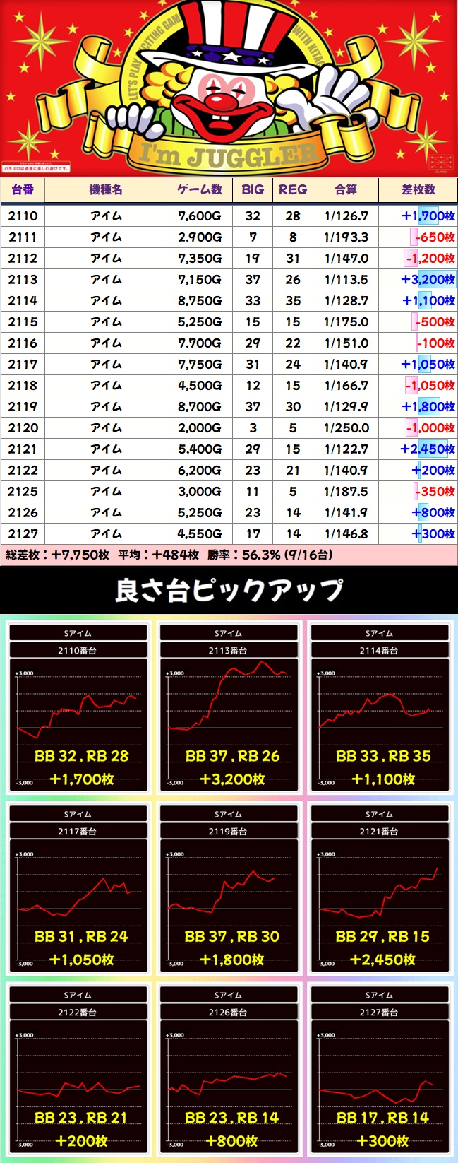【高配分】アイム(16台)|平均:+484枚