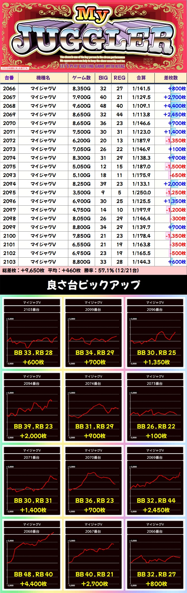 全台がプラス差枚となり、+2100枚も飛び出す安定した結果となりました!