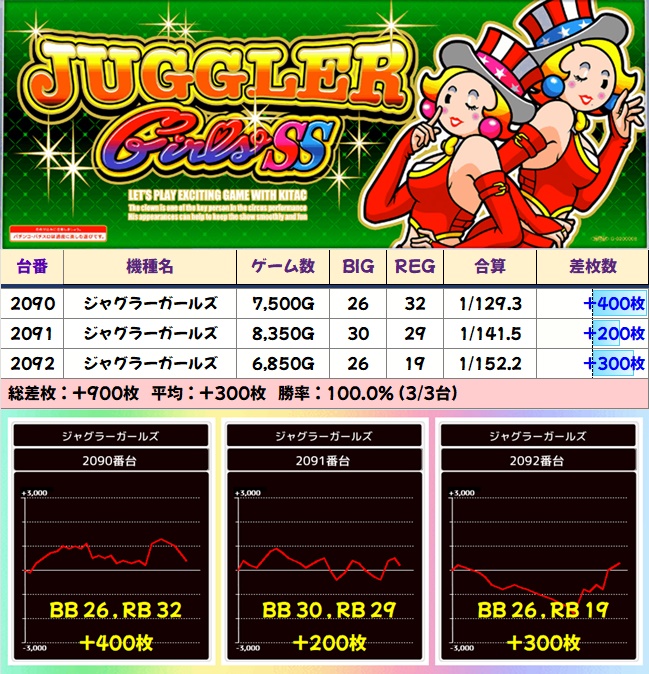 【全台系濃厚】ジャグラーガールズ(3台)|平均:+300枚
