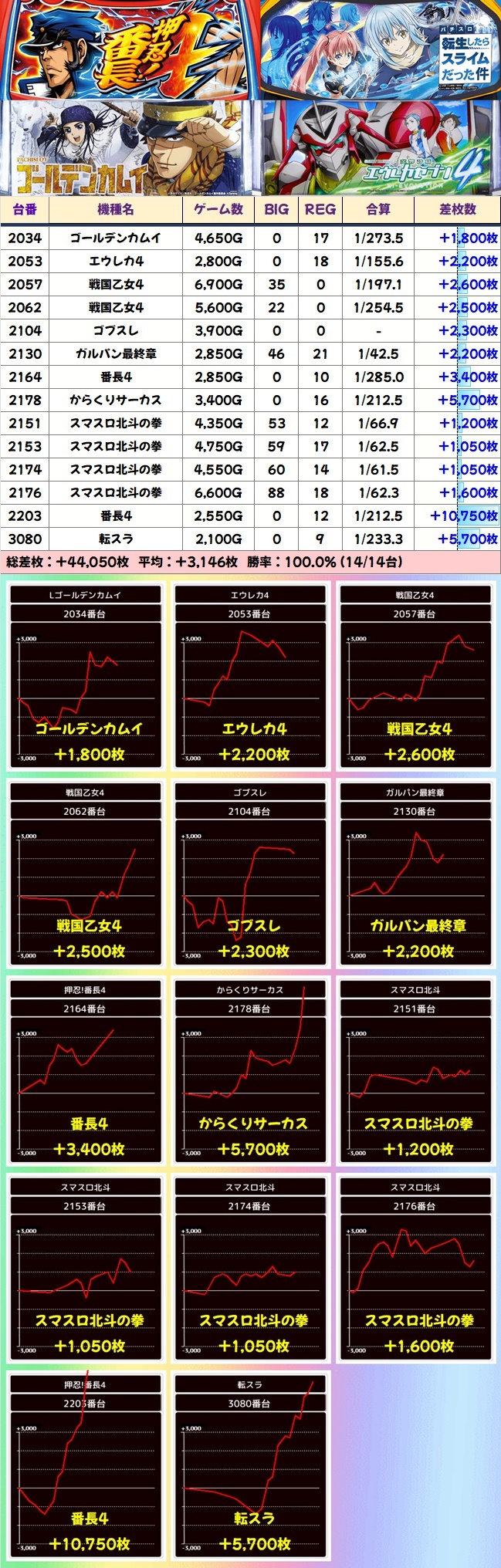 【単品濃厚】番長4・転スラ等(計14台)|平均:+1650枚